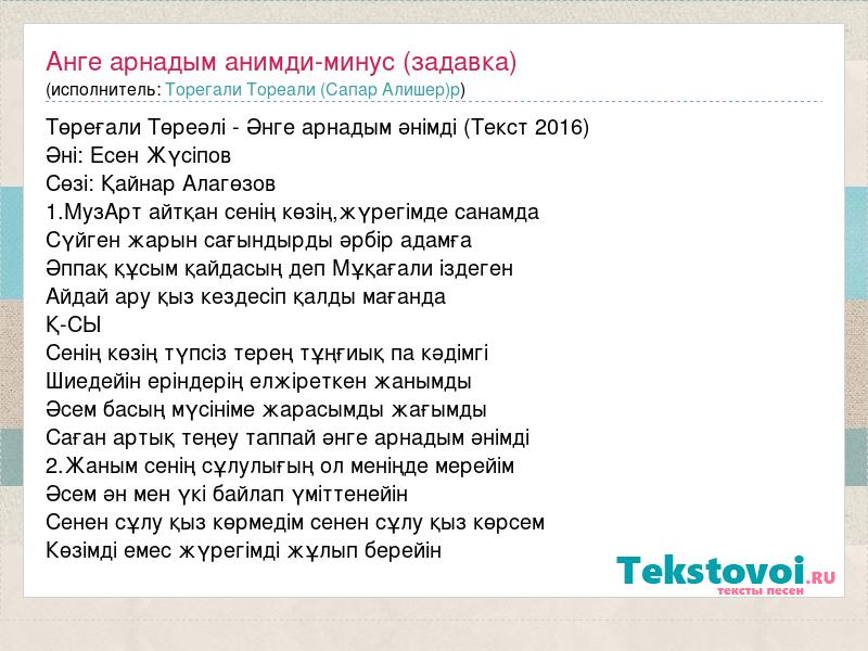 Төреғали Төреәлі - Әнге арнадым әнімді (Текст 2016) Әні: Есен Жүсіпов Сөзі: Қайнар Алагөзов 1.МузАрт айтқан сенің көзің,жүрегімде санамда Сүйген жарын сағындырды әрбір адамға Әппақ құсым қайдасың деп Мұқағали іздеген Айдай ару қыз кездесіп қалды мағанда Қ-СЫ Сенің көзің түпсіз терең тұңғиық па кәдімгі Шиедейін еріндерің елжіреткен жанымды Әсем басың мүсініме жарасымды жағымды Саған артық теңеу таппай әнге арнадым әнімді 2.Жаным сенің сұлулығың ол меніңде мерейім Әсем ән мен үкі байлап үміттенейін Сенен сұлу қыз көрмедім сенен сұлу қыз көрсем Көзімді емес жүрегімді жұлып берейін