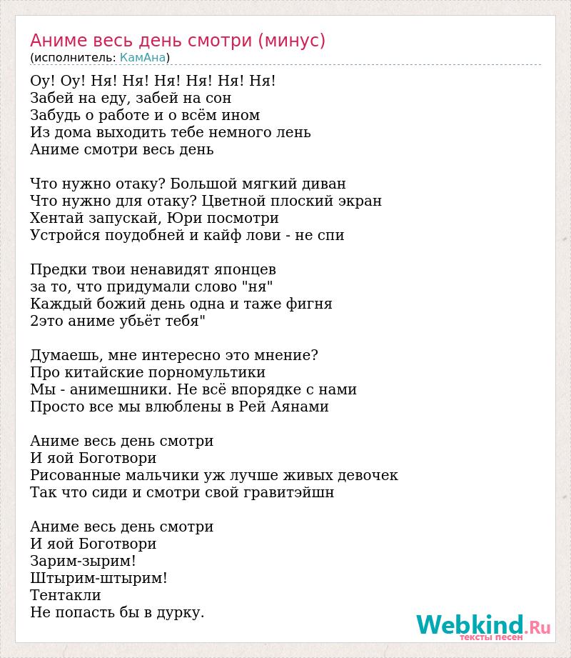 Оу! Оу! Ня! Ня! Ня! Ня! Ня! Ня! Забей на еду, забей на сон Забудь о работе и о всём ином Из дома выходить тебе немного лень Аниме смотри весь день Что нужно отаку? Большой мягкий диван Что нужно для отаку? Цветной плоский экран Хентай запускай, Юри посмотри Устройся поудобней и кайф лови - не спи Предки твои ненавидят японцев за то, что придумали слово "ня" Каждый божий день одна и таже фигня 2это аниме убьёт тебя" Думаешь, мне интересно это мнение? Про китайские порномультики Мы - анимешники. Не всё впорядке с нами Просто все мы влюблены в Рей Аянами Аниме весь день смотри И яой Боготвори Рисованные мальчики уж лучше живых девочек Так что сиди и смотри свой гравитэйшн Аниме весь день смотри И яой Боготвори Зарим-зырим! Штырим-штырим! Тентакли Не попасть бы в дурку.