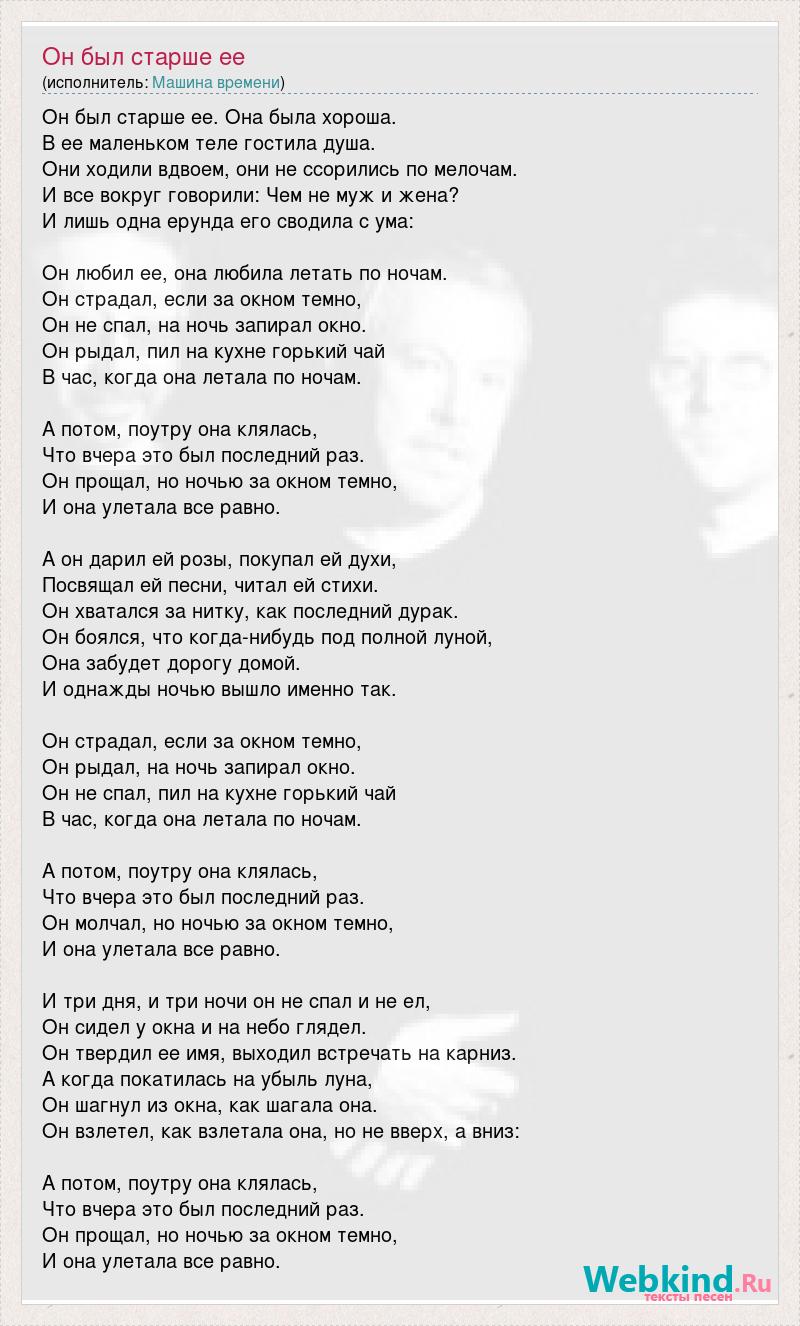 Он был старше ее. Она была хороша. В ее маленьком теле гостила душа. Они ходили вдвоем, они не ссорились по мелочам. И все вокруг говорили: Чем не муж и жена? И лишь одна ерунда его сводила с ума: Он любил ее, она любила летать по ночам. Он страдал, если за окном темно, Он не спал, на ночь запирал окно. Он рыдал, пил на кухне горький чай В час, когда она летала по ночам. А потом, поутру она клялась, Что вчера это был последний раз. Он прощал, но ночью за окном темно, И она улетала все равно. А он дарил ей розы, покупал ей духи, Посвящал ей песни, читал ей стихи. Он хватался за нитку, как последний дурак. Он боялся, что когда-нибудь под полной луной, Она забудет дорогу домой. И однажды ночью вышло именно так. Он страдал, если за окном темно, Он рыдал, на ночь запирал окно. Он не спал, пил на кухне горький чай В час, когда она летала по ночам. А потом, поутру она клялась, Что вчера это был последний раз. Он молчал, но ночью за окном темно, И она улетала все равно. И три дня, и три ночи он не спал и не ел, Он сидел у окна и на небо глядел. Он твердил ее имя, выходил встречать на карниз. А когда покатилась на убыль луна, Он шагнул из окна, как шагала она. Он взлетел, как взлетала она, но не вверх, а вниз: А потом, поутру она клялась, Что вчера это был последний раз. Он прощал, но ночью за окном темно, И она улетала все равно.