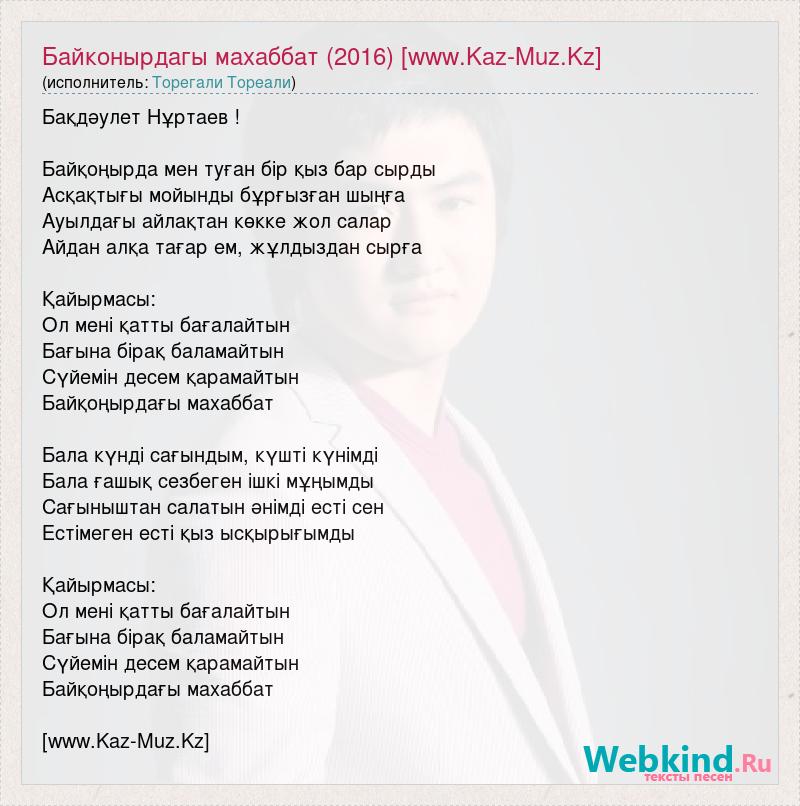 Бақдәулет Нұртаев ! Байқоңырда мен туған бір қыз бар сырды Асқақтығы мойынды бұрғызған шыңға Ауылдағы айлақтан көкке жол салар Айдан алқа тағар ем, жұлдыздан сырға Қайырмасы: Ол мені қатты бағалайтын Бағына бірақ баламайтын Сүйемін десем қарамайтын Байқоңырдағы махаббат Бала күнді сағындым, күшті күнімді Бала ғашық сезбеген ішкі мұңымды Сағыныштан салатын әнімді есті сен Естімеген есті қыз ысқырығымды Қайырмасы: Ол мені қатты бағалайтын Бағына бірақ баламайтын Сүйемін десем қарамайтын Байқоңырдағы махаббат [www.Kaz-Muz.Kz]