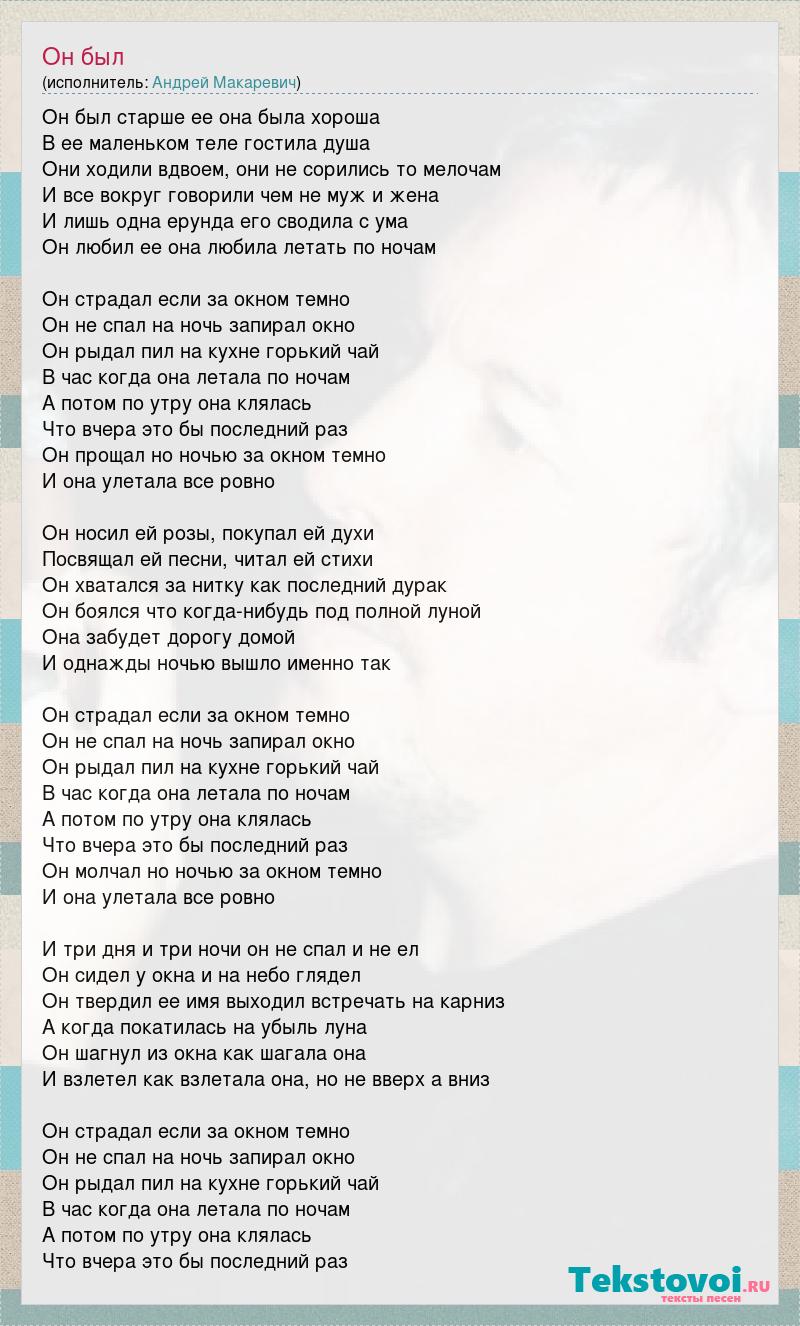 Он был старше ее она была хороша В ее маленьком теле гостила душа Они ходили вдвоем, они не сорились то мелочам И все вокруг говорили чем не муж и жена И лишь одна ерунда его сводила с ума Он любил ее она любила летать по ночам Он страдал если за окном темно Он не спал на ночь запирал окно Он рыдал пил на кухне горький чай В час когда она летала по ночам А потом по утру она клялась Что вчера это бы последний раз Он прощал но ночью за окном темно И она улетала все ровно Он носил ей розы, покупал ей духи Посвящал ей песни, читал ей стихи Он хватался за нитку как последний дурак Он боялся что когда-нибудь под полной луной Она забудет дорогу домой И однажды ночью вышло именно так Он страдал если за окном темно Он не спал на ночь запирал окно Он рыдал пил на кухне горький чай В час когда она летала по ночам А потом по утру она клялась Что вчера это бы последний раз Он молчал но ночью за окном темно И она улетала все ровно И три дня и три ночи он не спал и не ел Он сидел у окна и на небо глядел Он твердил ее имя выходил встречать на карниз А когда покатилась на убыль луна Он шагнул из окна как шагала она И взлетел как взлетала она, но не вверх а вниз Он страдал если за окном темно Он не спал на ночь запирал окно Он рыдал пил на кухне горький чай В час когда она летала по ночам А потом по утру она клялась Что вчера это бы последний раз