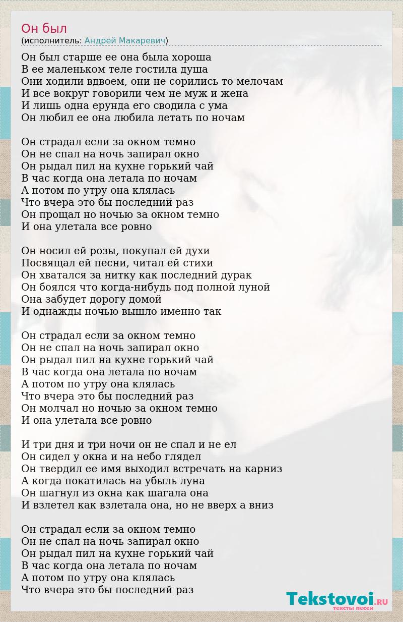 Он был старше ее она была хороша В ее маленьком теле гостила душа Они ходили вдвоем, они не сорились то мелочам И все вокруг говорили чем не муж и жена И лишь одна ерунда его сводила с ума Он любил ее она любила летать по ночам Он страдал если за окном темно Он не спал на ночь запирал окно Он рыдал пил на кухне горький чай В час когда она летала по ночам А потом по утру она клялась Что вчера это бы последний раз Он прощал но ночью за окном темно И она улетала все ровно Он носил ей розы, покупал ей духи Посвящал ей песни, читал ей стихи Он хватался за нитку как последний дурак Он боялся что когда-нибудь под полной луной Она забудет дорогу домой И однажды ночью вышло именно так Он страдал если за окном темно Он не спал на ночь запирал окно Он рыдал пил на кухне горький чай В час когда она летала по ночам А потом по утру она клялась Что вчера это бы последний раз Он молчал но ночью за окном темно И она улетала все ровно И три дня и три ночи он не спал и не ел Он сидел у окна и на небо глядел Он твердил ее имя выходил встречать на карниз А когда покатилась на убыль луна Он шагнул из окна как шагала она И взлетел как взлетала она, но не вверх а вниз Он страдал если за окном темно Он не спал на ночь запирал окно Он рыдал пил на кухне горький чай В час когда она летала по ночам А потом по утру она клялась Что вчера это бы последний раз