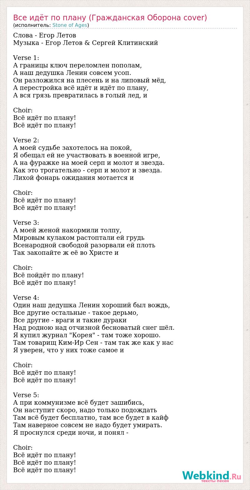 Слова - Егор Летов Музыка - Егор Летов & Сергей Клитинский Verse 1: А границы ключ переломлен пополам, А наш дедушка Ленин совсем усоп. Он разложился на плесень и на липовый мëд, А перестройка всë идëт и идëт по плану, А вся грязь превратилась в голый лед, и Choir: Всë идëт по плану! Всë идëт по плану! Verse 2: А моей судьбе захотелось на покой, Я обещал ей не участвовать в военной игре, А на фуражке на моей серп и молот и звезда. Как это трогательно - серп и молот и звезда. Лихой фонарь ожидания мотается и Choir: Всë идëт по плану! Всë идëт по плану! Verse 3: А моей женой накормили толпу, Мировым кулаком растоптали ей грудь Всенародной свободой разорвали ей плоть Так закопайте ж еë во Христе и Choir: Всë пойдëт по плану! Всë идëт по плану! Verse 4: Один наш дедушка Ленин хороший был вождь, Все другие остальные - такое дерьмо, Все другие - враги и такие дураки Над родною над отчизной бесноватый снег шëл. Я купил журнал "Корея" - там тоже хорошо. Там товарищ Ким-Ир Сен - там так же как у нас Я уверен, что у них тоже самое и Choir: Всë идëт по плану! Всë идëт по плану! Verse 5: А при коммунизме всë будет зашибись, Он наступит скоро, надо только подождать Там всë будет бесплатно, там все будет в кайф Там наверное совсем не надо будет умирать. Я проснулся среди ночи, и понял - Choir: Всë идëт по плану! Всë идëт по плану! Всë идëт по плану!