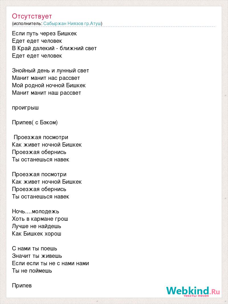 Если путь через Бишкек Едет едет человек В Край далекий - ближний свет Едет едет человек Знойный день и лунный свет Манит манит нас рассвет Мой родной ночной Бишкек Манит манит наш рассвет проигрыш Припев( с Бэком) Проезжая посмотри Как живет ночной Бишкек Проезжая обернись Ты останешься навек Проезжая посмотри Как живет ночной Бишкек Проезжая обернись Ты останешься навек Ночь....молодежь Хоть в кармане грош Лучше не найдешь Как Бишкек хорош С нами ты поешь Значит ты живешь Если если ты не с нами нами Ты не поймешь Припев