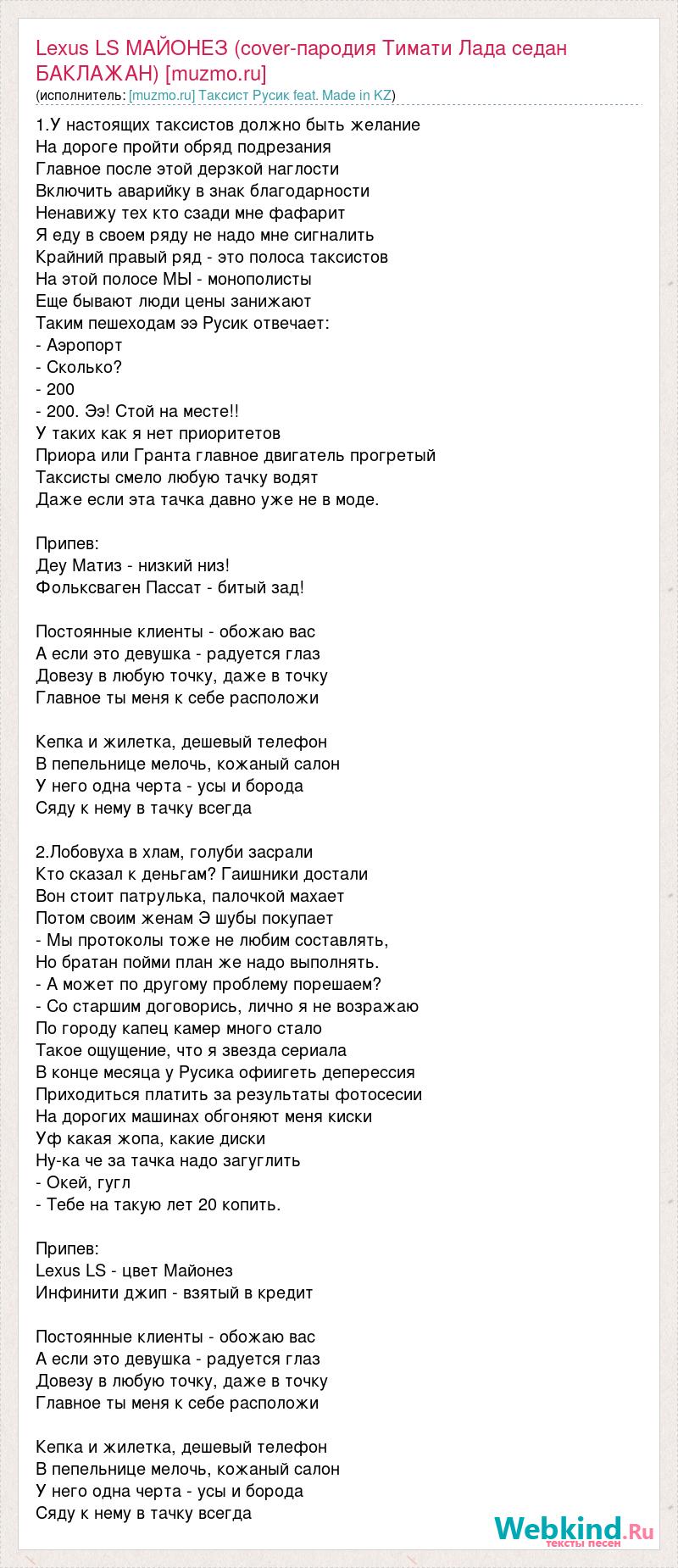 1.У настоящих таксистов должно быть желание На дороге пройти обряд подрезания Главное после этой дерзкой наглости Включить аварийку в знак благодарности Ненавижу тех кто сзади мне фафарит Я еду в своем ряду не надо мне сигналить Крайний правый ряд - это полоса таксистов На этой полосе МЫ - монополисты Еще бывают люди цены занижают Таким пешеходам ээ Русик отвечает: - Аэропорт - Сколько? - 200 - 200. Ээ! Стой на месте!! У таких как я нет приоритетов Приора или Гранта главное двигатель прогретый Таксисты смело любую тачку водят Даже если эта тачка давно уже не в моде. Припев: Деу Матиз - низкий низ! Фольксваген Пассат - битый зад! Постоянные клиенты - обожаю вас А если это девушка - радуется глаз Довезу в любую точку, даже в точку Главное ты меня к себе расположи Кепка и жилетка, дешевый телефон В пепельнице мелочь, кожаный салон У него одна черта - усы и борода Сяду к нему в тачку всегда 2.Лобовуха в хлам, голуби засрали Кто сказал к деньгам? Гаишники достали Вон стоит патрулька, палочкой махает Потом своим женам Э шубы покупает - Мы протоколы тоже не любим составлять, Но братан пойми план же надо выполнять. - А может по другому проблему порешаем? - Со старшим договорись, лично я не возражаю По городу капец камер много стало Такое ощущение, что я звезда сериала В конце месяца у Русика офиигеть деперессия Приходиться платить за результаты фотосесии На дорогих машинах обгоняют меня киски Уф какая жопа, какие диски Ну-ка че за тачка надо загуглить - Окей, гугл - Тебе на такую лет 20 копить. Припев: Lexus LS - цвет Майонез Инфинити джип - взятый в кредит Постоянные клиенты - обожаю вас А если это девушка - радуется глаз Довезу в любую точку, даже в точку Главное ты меня к себе расположи Кепка и жилетка, дешевый телефон В пепельнице мелочь, кожаный салон У него одна черта - усы и борода Сяду к нему в тачку всегда