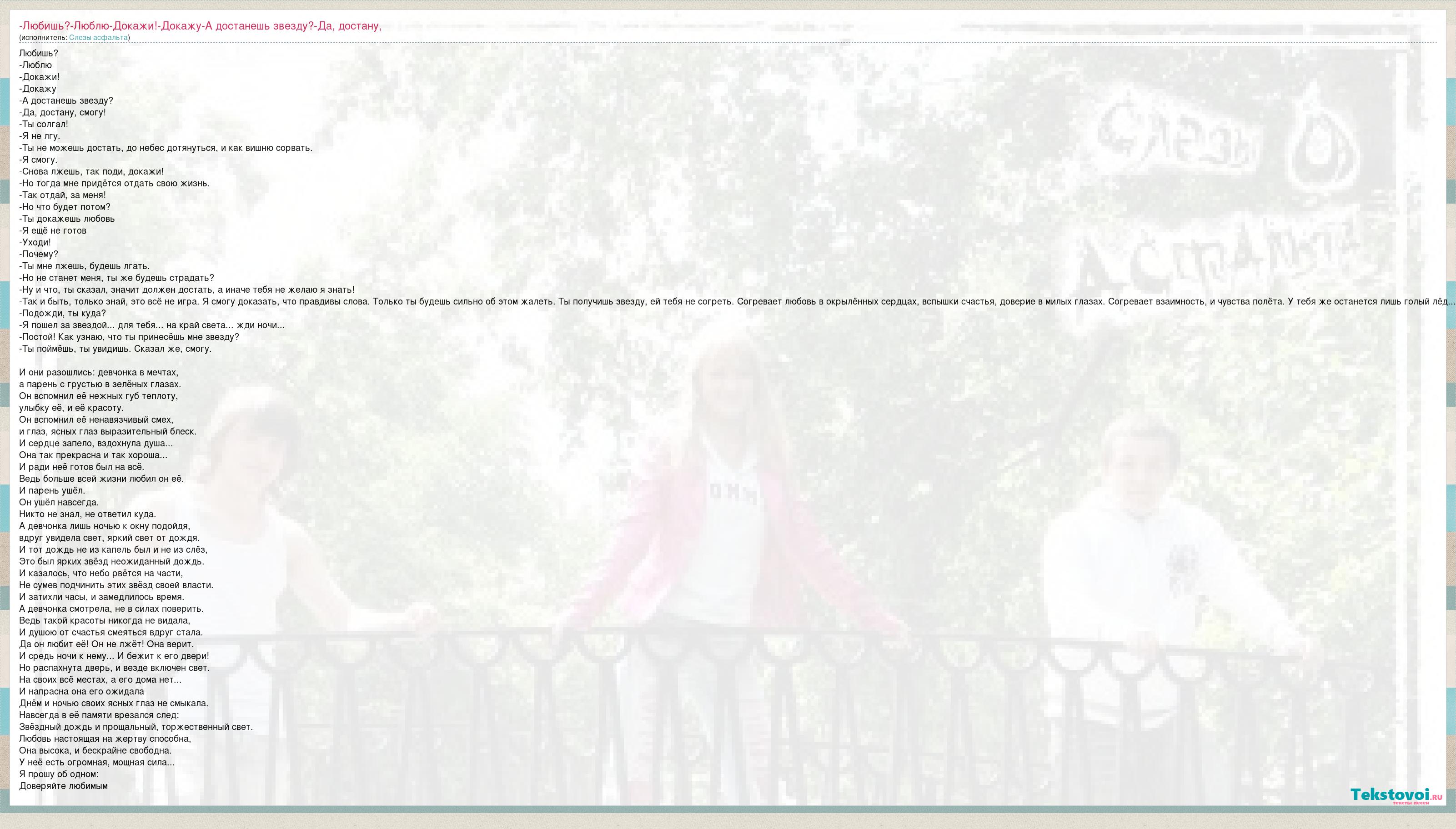 Любишь? -Люблю -Докажи! -Докажу -А достанешь звезду? -Да, достану, смогу! -Ты солгал! -Я не лгу. -Ты не можешь достать, до небес дотянуться, и как вишню сорвать. -Я смогу. -Снова лжешь, так поди, докажи! -Но тогда мне придётся отдать свою жизнь. -Так отдай, за меня! -Но что будет потом? -Ты докажешь любовь -Я ещё не готов -Уходи! -Почему? -Ты мне лжешь, будешь лгать. -Но не станет меня, ты же будешь страдать? -Ну и что, ты сказал, значит должен достать, а иначе тебя не желаю я знать! -Так и быть, только знай, это всё не игра. Я смогу доказать, что правдивы слова. Только ты будешь сильно об этом жалеть. Ты получишь звезду, ей тебя не согреть. Согревает любовь в окрылённых сердцах, вспышки счастья, доверие в милых глазах. Согревает взаимность, и чувства полёта. У тебя же останется лишь голый лёд... -Подожди, ты куда? -Я пошел за звездой... для тебя... на край света... жди ночи... -Постой! Как узнаю, что ты принесёшь мне звезду? -Ты поймёшь, ты увидишь. Сказал же, смогу. И они разошлись: девчонка в мечтах, а парень с грустью в зелёных глазах. Он вспомнил её нежных губ теплоту, улыбку её, и её красоту. Он вспомнил её ненавязчивый смех, и глаз, ясных глаз выразительный блеск. И сердце запело, вздохнула душа... Она так прекрасна и так хороша... И ради неё готов был на всё. Ведь больше всей жизни любил он её. И парень ушёл. Он ушёл навсегда. Никто не знал, не ответил куда. А девчонка лишь ночью к окну подойдя, вдруг увидела свет, яркий свет от дождя. И тот дождь не из капель был и не из слёз, Это был ярких звёзд неожиданный дождь. И казалось, что небо рвётся на части, Не сумев подчинить этих звёзд своей власти. И затихли часы, и замедлилось время. А девчонка смотрела, не в силах поверить. Ведь такой красоты никогда не видала, И душою от счастья смеяться вдруг стала. Да он любит её! Он не лжёт! Она верит. И средь ночи к нему... И бежит к его двери! Но распахнута дверь, и везде включен свет. На своих всё местах, а его дома нет... И напрасна она его ожидала Днём и ночью своих ясных глаз не смыкала. Навсегда в её памяти врезался след: Звёздный дождь и прощальный, торжественный свет. Любовь настоящая на жертву способна, Она высока, и бескрайне свободна. У неё есть огромная, мощная сила... Я прошу об одном: Доверяйте любимым
