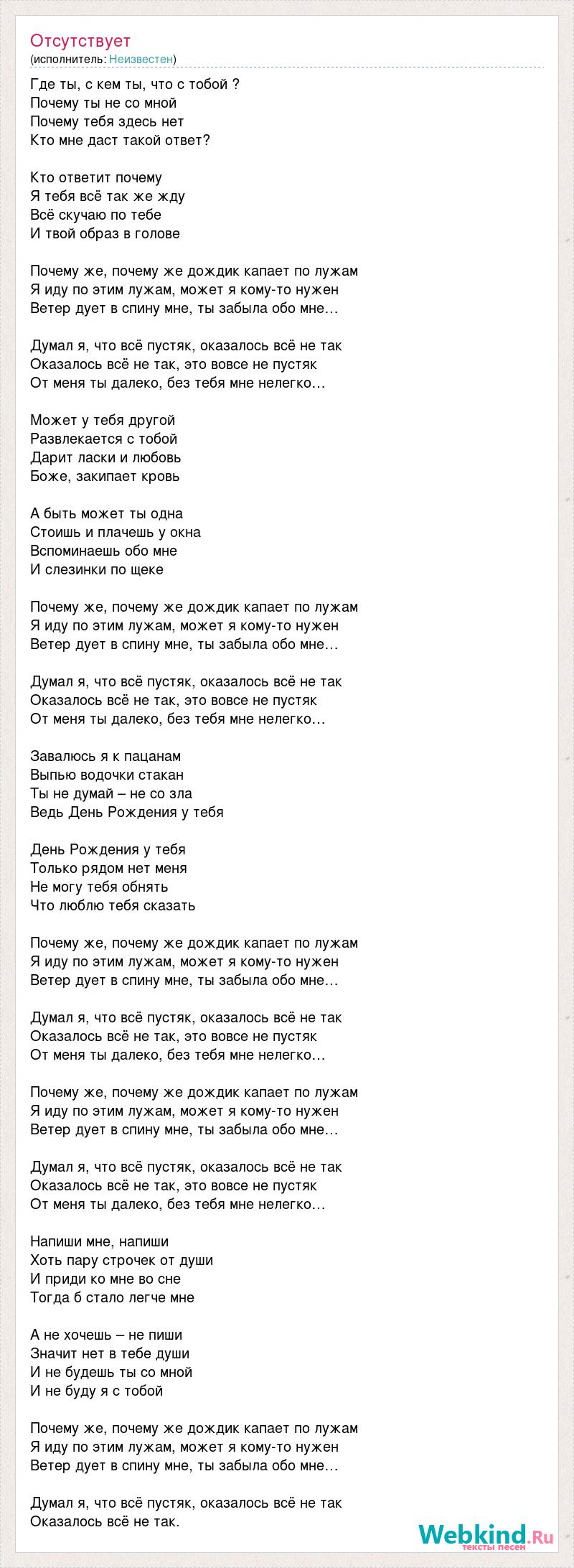 Где ты, с кем ты, что с тобой ? Почему ты не со мной Почему тебя здесь нет Кто мне даст такой ответ? Кто ответит почему Я тебя всё так же жду Всё скучаю по тебе И твой образ в голове Почему же, почему же дождик капает по лужам Я иду по этим лужам, может я кому-то нужен Ветер дует в спину мне, ты забыла обо мне… Думал я, что всё пустяк, оказалось всё не так Оказалось всё не так, это вовсе не пустяк От меня ты далеко, без тебя мне нелегко… Может у тебя другой Развлекается с тобой Дарит ласки и любовь Боже, закипает кровь А быть может ты одна Стоишь и плачешь у окна Вспоминаешь обо мне И слезинки по щеке Почему же, почему же дождик капает по лужам Я иду по этим лужам, может я кому-то нужен Ветер дует в спину мне, ты забыла обо мне… Думал я, что всё пустяк, оказалось всё не так Оказалось всё не так, это вовсе не пустяк От меня ты далеко, без тебя мне нелегко… Завалюсь я к пацанам Выпью водочки стакан Ты не думай – не со зла Ведь День Рождения у тебя День Рождения у тебя Только рядом нет меня Не могу тебя обнять Что люблю тебя сказать Почему же, почему же дождик капает по лужам Я иду по этим лужам, может я кому-то нужен Ветер дует в спину мне, ты забыла обо мне… Думал я, что всё пустяк, оказалось всё не так Оказалось всё не так, это вовсе не пустяк От меня ты далеко, без тебя мне нелегко… Почему же, почему же дождик капает по лужам Я иду по этим лужам, может я кому-то нужен Ветер дует в спину мне, ты забыла обо мне… Думал я, что всё пустяк, оказалось всё не так Оказалось всё не так, это вовсе не пустяк От меня ты далеко, без тебя мне нелегко… Напиши мне, напиши Хоть пару строчек от души И приди ко мне во сне Тогда б стало легче мне А не хочешь – не пиши Значит нет в тебе души И не будешь ты со мной И не буду я с тобой Почему же, почему же дождик капает по лужам Я иду по этим лужам, может я кому-то нужен Ветер дует в спину мне, ты забыла обо мне… Думал я, что всё пустяк, оказалось всё не так Оказалось всё не так.