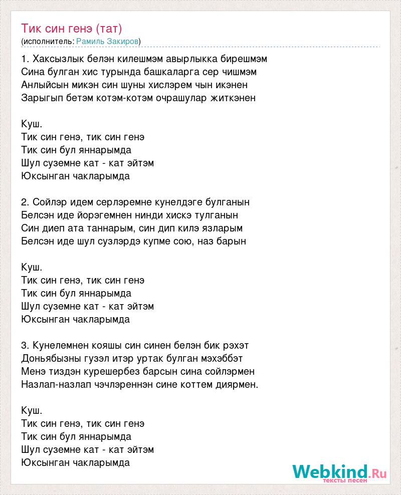 1. Хаксызлык белэн килешмэм авырлыкка бирешмэм Сина булган хис турында башкаларга сер чишмэм Анлыйсын микэн син шуны хислэрем чын икэнен Зарыгып бетэм котэм-котэм очрашулар житкэнен Куш. Тик син генэ, тик син генэ Тик син бул яннарымда Шул суземне кат - кат эйтэм Юксынган чакларымда 2. Сойлэр идем серлэремне кунелдэге булганын Белсэн иде йорэгемнен нинди хискэ тулганын Син диеп ата таннарым, син дип килэ язларым Белсэн иде шул сузлэрдэ купме сою, наз барын Куш. Тик син генэ, тик син генэ Тик син бул яннарымда Шул суземне кат - кат эйтэм Юксынган чакларымда 3. Кунелемнен кояшы син синен белэн бик рэхэт Доньябызны гузэл итэр уртак булган мэхэббэт Менэ тиздэн курешербез барсын сина сойлэрмен Назлап-назлап чэчлэреннэн сине коттем диярмен. Куш. Тик син генэ, тик син генэ Тик син бул яннарымда Шул суземне кат - кат эйтэм Юксынган чакларымда