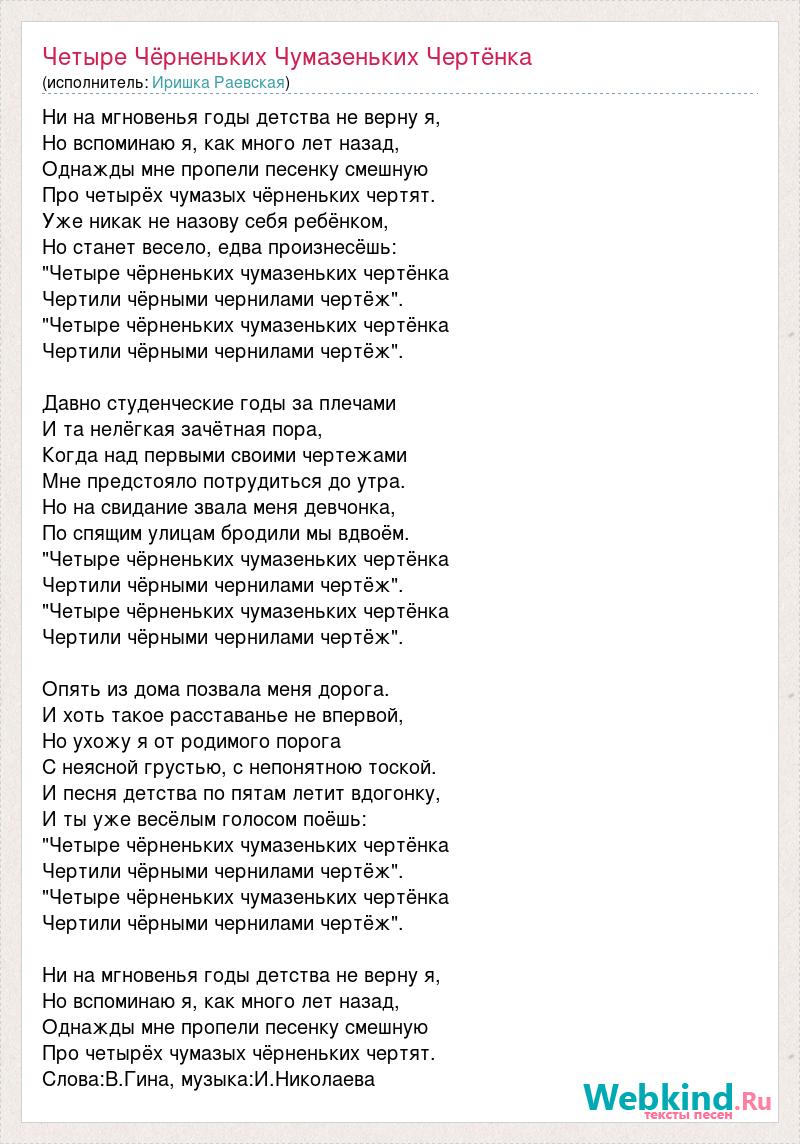 Ни на мгновенья годы детства не верну я, Но вспоминаю я, как много лет назад, Однажды мне пропели песенку смешную Про четырёх чумазых чёрненьких чертят. Уже никак не назову себя ребёнком, Но станет весело, едва произнесёшь: "Четыре чёрненьких чумазеньких чертёнка Чертили чёрными чернилами чертёж". "Четыре чёрненьких чумазеньких чертёнка Чертили чёрными чернилами чертёж". Давно студенческие годы за плечами И та нелёгкая зачётная пора, Когда над первыми своими чертежами Мне предстояло потрудиться до утра. Но на свидание звала меня девчонка, По спящим улицам бродили мы вдвоём. "Четыре чёрненьких чумазеньких чертёнка Чертили чёрными чернилами чертёж". "Четыре чёрненьких чумазеньких чертёнка Чертили чёрными чернилами чертёж". Опять из дома позвала меня дорога. И хоть такое расставанье не впервой, Но ухожу я от родимого порога С неясной грустью, с непонятною тоской. И песня детства по пятам летит вдогонку, И ты уже весёлым голосом поёшь: "Четыре чёрненьких чумазеньких чертёнка Чертили чёрными чернилами чертёж". "Четыре чёрненьких чумазеньких чертёнка Чертили чёрными чернилами чертёж". Ни на мгновенья годы детства не верну я, Но вспоминаю я, как много лет назад, Однажды мне пропели песенку смешную Про четырёх чумазых чёрненьких чертят. Слова:В.Гина, музыка:И.Николаева