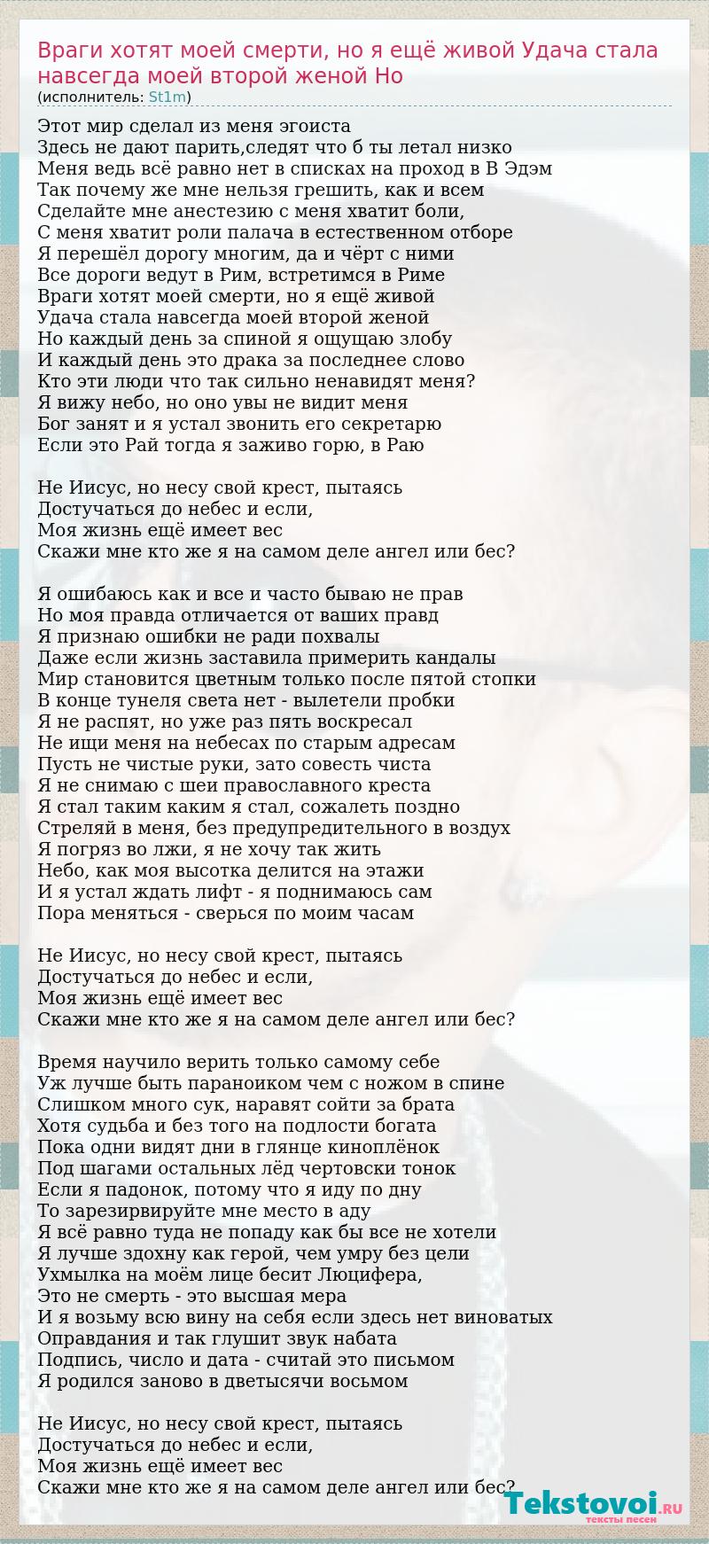 Этот мир сделал из меня эгоиста Здесь не дают парить,следят что б ты летал низко Меня ведь всё равно нет в списках на проход в В Эдэм Так почему же мне нельзя грешить, как и всем Сделайте мне анестезию с меня хватит боли, С меня хватит роли палача в естественном отборе Я перешёл дорогу многим, да и чёрт с ними Все дороги ведут в Рим, встретимся в Риме Враги хотят моей смерти, но я ещё живой Удача стала навсегда моей второй женой Но каждый день за спиной я ощущаю злобу И каждый день это драка за последнее слово Кто эти люди что так сильно ненавидят меня? Я вижу небо, но оно увы не видит меня Бог занят и я устал звонить его секретарю Если это Рай тогда я заживо горю, в Раю Не Иисус, но несу свой крест, пытаясь Достучаться до небес и если, Моя жизнь ещё имеет вес Скажи мне кто же я на самом деле ангел или бес? Я ошибаюсь как и все и часто бываю не прав Но моя правда отличается от ваших правд Я признаю ошибки не ради похвалы Даже если жизнь заставила примерить кандалы Мир становится цветным только после пятой стопки В конце тунеля света нет - вылетели пробки Я не распят, но уже раз пять воскресал Не ищи меня на небесах по старым адресам Пусть не чистые руки, зато совесть чиста Я не снимаю с шеи православного креста Я стал таким каким я стал, сожалеть поздно Стреляй в меня, без предупредительного в воздух Я погряз во лжи, я не хочу так жить Небо, как моя высотка делится на этажи И я устал ждать лифт - я поднимаюсь сам Пора меняться - сверься по моим часам Не Иисус, но несу свой крест, пытаясь Достучаться до небес и если, Моя жизнь ещё имеет вес Скажи мне кто же я на самом деле ангел или бес? Время научило верить только самому себе Уж лучше быть параноиком чем с ножом в спине Слишком много сук, наравят сойти за брата Хотя судьба и без того на подлости богата Пока одни видят дни в глянце киноплёнок Под шагами остальных лёд чертовски тонок Если я падонок, потому что я иду по дну То зарезирвируйте мне место в аду Я всё равно туда не попаду как бы все не хотели Я лучше здохну как герой, чем умру без цели Ухмылка на моём лице бесит Люцифера, Это не смерть - это высшая мера И я возьму всю вину на себя если здесь нет виноватых Оправдания и так глушит звук набата Подпись, число и дата - считай это письмом Я родился заново в дветысячи восьмом Не Иисус, но несу свой крест, пытаясь Достучаться до небес и если, Моя жизнь ещё имеет вес Скажи мне кто же я на самом деле ангел или бес?