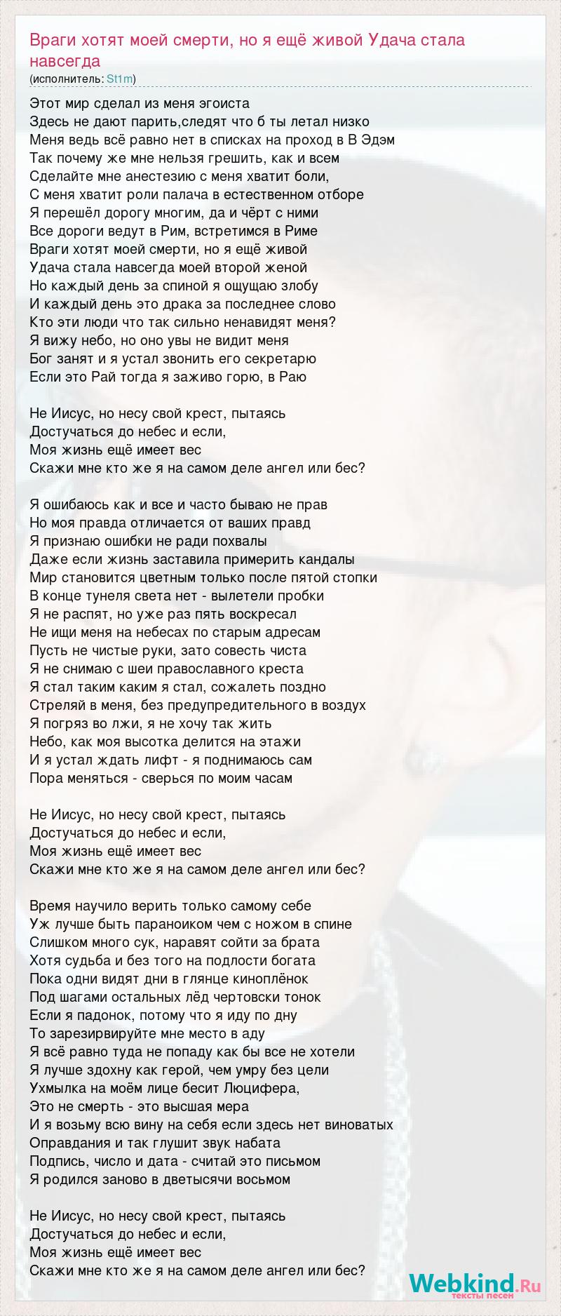 Этот мир сделал из меня эгоиста Здесь не дают парить,следят что б ты летал низко Меня ведь всё равно нет в списках на проход в В Эдэм Так почему же мне нельзя грешить, как и всем Сделайте мне анестезию с меня хватит боли, С меня хватит роли палача в естественном отборе Я перешёл дорогу многим, да и чёрт с ними Все дороги ведут в Рим, встретимся в Риме Враги хотят моей смерти, но я ещё живой Удача стала навсегда моей второй женой Но каждый день за спиной я ощущаю злобу И каждый день это драка за последнее слово Кто эти люди что так сильно ненавидят меня? Я вижу небо, но оно увы не видит меня Бог занят и я устал звонить его секретарю Если это Рай тогда я заживо горю, в Раю Не Иисус, но несу свой крест, пытаясь Достучаться до небес и если, Моя жизнь ещё имеет вес Скажи мне кто же я на самом деле ангел или бес? Я ошибаюсь как и все и часто бываю не прав Но моя правда отличается от ваших правд Я признаю ошибки не ради похвалы Даже если жизнь заставила примерить кандалы Мир становится цветным только после пятой стопки В конце тунеля света нет - вылетели пробки Я не распят, но уже раз пять воскресал Не ищи меня на небесах по старым адресам Пусть не чистые руки, зато совесть чиста Я не снимаю с шеи православного креста Я стал таким каким я стал, сожалеть поздно Стреляй в меня, без предупредительного в воздух Я погряз во лжи, я не хочу так жить Небо, как моя высотка делится на этажи И я устал ждать лифт - я поднимаюсь сам Пора меняться - сверься по моим часам Не Иисус, но несу свой крест, пытаясь Достучаться до небес и если, Моя жизнь ещё имеет вес Скажи мне кто же я на самом деле ангел или бес? Время научило верить только самому себе Уж лучше быть параноиком чем с ножом в спине Слишком много сук, наравят сойти за брата Хотя судьба и без того на подлости богата Пока одни видят дни в глянце киноплёнок Под шагами остальных лёд чертовски тонок Если я падонок, потому что я иду по дну То зарезирвируйте мне место в аду Я всё равно туда не попаду как бы все не хотели Я лучше здохну как герой, чем умру без цели Ухмылка на моём лице бесит Люцифера, Это не смерть - это высшая мера И я возьму всю вину на себя если здесь нет виноватых Оправдания и так глушит звук набата Подпись, число и дата - считай это письмом Я родился заново в дветысячи восьмом Не Иисус, но несу свой крест, пытаясь Достучаться до небес и если, Моя жизнь ещё имеет вес Скажи мне кто же я на самом деле ангел или бес?