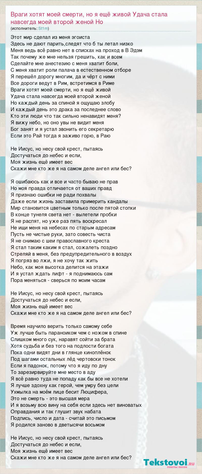 Этот мир сделал из меня эгоиста Здесь не дают парить,следят что б ты летал низко Меня ведь всё равно нет в списках на проход в В Эдэм Так почему же мне нельзя грешить, как и всем Сделайте мне анестезию с меня хватит боли, С меня хватит роли палача в естественном отборе Я перешёл дорогу многим, да и чёрт с ними Все дороги ведут в Рим, встретимся в Риме Враги хотят моей смерти, но я ещё живой Удача стала навсегда моей второй женой Но каждый день за спиной я ощущаю злобу И каждый день это драка за последнее слово Кто эти люди что так сильно ненавидят меня? Я вижу небо, но оно увы не видит меня Бог занят и я устал звонить его секретарю Если это Рай тогда я заживо горю, в Раю Не Иисус, но несу свой крест, пытаясь Достучаться до небес и если, Моя жизнь ещё имеет вес Скажи мне кто же я на самом деле ангел или бес? Я ошибаюсь как и все и часто бываю не прав Но моя правда отличается от ваших правд Я признаю ошибки не ради похвалы Даже если жизнь заставила примерить кандалы Мир становится цветным только после пятой стопки В конце тунеля света нет - вылетели пробки Я не распят, но уже раз пять воскресал Не ищи меня на небесах по старым адресам Пусть не чистые руки, зато совесть чиста Я не снимаю с шеи православного креста Я стал таким каким я стал, сожалеть поздно Стреляй в меня, без предупредительного в воздух Я погряз во лжи, я не хочу так жить Небо, как моя высотка делится на этажи И я устал ждать лифт - я поднимаюсь сам Пора меняться - сверься по моим часам Не Иисус, но несу свой крест, пытаясь Достучаться до небес и если, Моя жизнь ещё имеет вес Скажи мне кто же я на самом деле ангел или бес? Время научило верить только самому себе Уж лучше быть параноиком чем с ножом в спине Слишком много сук, наравят сойти за брата Хотя судьба и без того на подлости богата Пока одни видят дни в глянце киноплёнок Под шагами остальных лёд чертовски тонок Если я падонок, потому что я иду по дну То зарезирвируйте мне место в аду Я всё равно туда не попаду как бы все не хотели Я лучше здохну как герой, чем умру без цели Ухмылка на моём лице бесит Люцифера, Это не смерть - это высшая мера И я возьму всю вину на себя если здесь нет виноватых Оправдания и так глушит звук набата Подпись, число и дата - считай это письмом Я родился заново в дветысячи восьмом Не Иисус, но несу свой крест, пытаясь Достучаться до небес и если, Моя жизнь ещё имеет вес Скажи мне кто же я на самом деле ангел или бес?