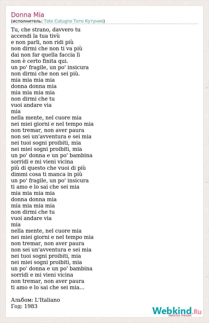 Tu, che strano, davvero tu accendi la tua tivù e non parli, non ridi più non dirmi che non ti va più dai non far quella faccia lì non è certo finita qui. un po' fragile, un po' insicura non dirmi che non sei più. mia mia mia mia donna donna mia mia mia mia mia non dirmi che tu vuoi andare via mia nella mente, nel cuore mia nei miei giorni e nel tempo mia non tremar, non aver paura non sei un'avventura e sei mia nei tuoi sogni proibiti, mia nei miei sogni proibiti, mia un po' donna e un po' bambina sorridi e mi vieni vicina più di questo che vuoi di più dimmi cosa ti manca in più un po' fragile, un po' insicura ti amo e lo sai che sei mia mia mia mia mia donna donna mia mia mia mia mia non dirmi che tu vuoi andare via mia nella mente, nel cuore mia nei miei giorni e nel tempo mia non tremar, non aver paura non sei un'avventura e sei mia nei tuoi sogni proibiti, mia nei miei sogni proibiti, mia un po' donna e un po' bambina sorridi e mi vieni vicina non tremar, non aver paura ti amo e lo sai che sei mia... Альбом: L'Italiano Год: 1983