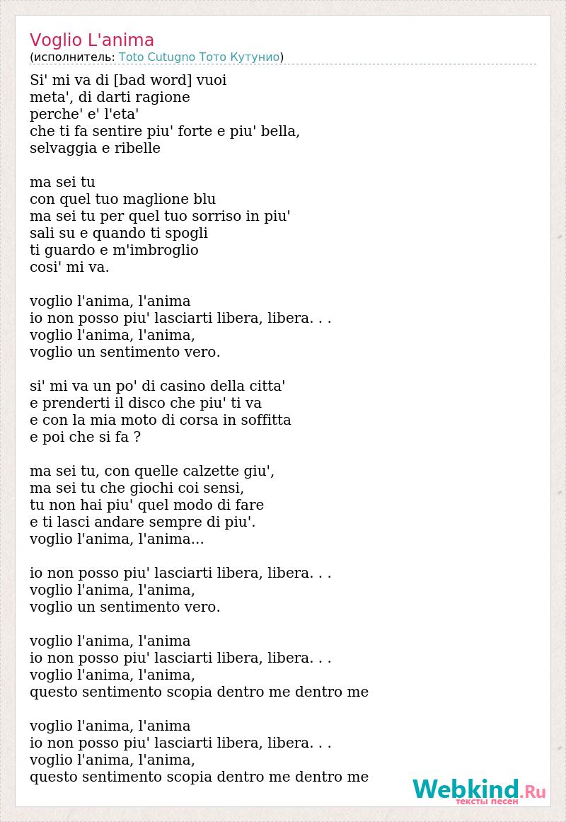 Si' mi va di [bad word] vuoi meta', di darti ragione perche' e' l'eta' che ti fa sentire piu' forte e piu' bella, selvaggia e ribelle ma sei tu con quel tuo maglione blu ma sei tu per quel tuo sorriso in piu' sali su e quando ti spogli ti guardo e m'imbroglio cosi' mi va. voglio l'anima, l'anima io non posso piu' lasciarti libera, libera. . . voglio l'anima, l'anima, voglio un sentimento vero. si' mi va un po' di casino della citta' e prenderti il disco che piu' ti va e con la mia moto di corsa in soffitta e poi che si fa ? ma sei tu, con quelle calzette giu', ma sei tu che giochi coi sensi, tu non hai piu' quel modo di fare e ti lasci andare sempre di piu'. voglio l'anima, l'anima... io non posso piu' lasciarti libera, libera. . . voglio l'anima, l'anima, voglio un sentimento vero. voglio l'anima, l'anima io non posso piu' lasciarti libera, libera. . . voglio l'anima, l'anima, questo sentimento scopia dentro me dentro me voglio l'anima, l'anima io non posso piu' lasciarti libera, libera. . . voglio l'anima, l'anima, questo sentimento scopia dentro me dentro me