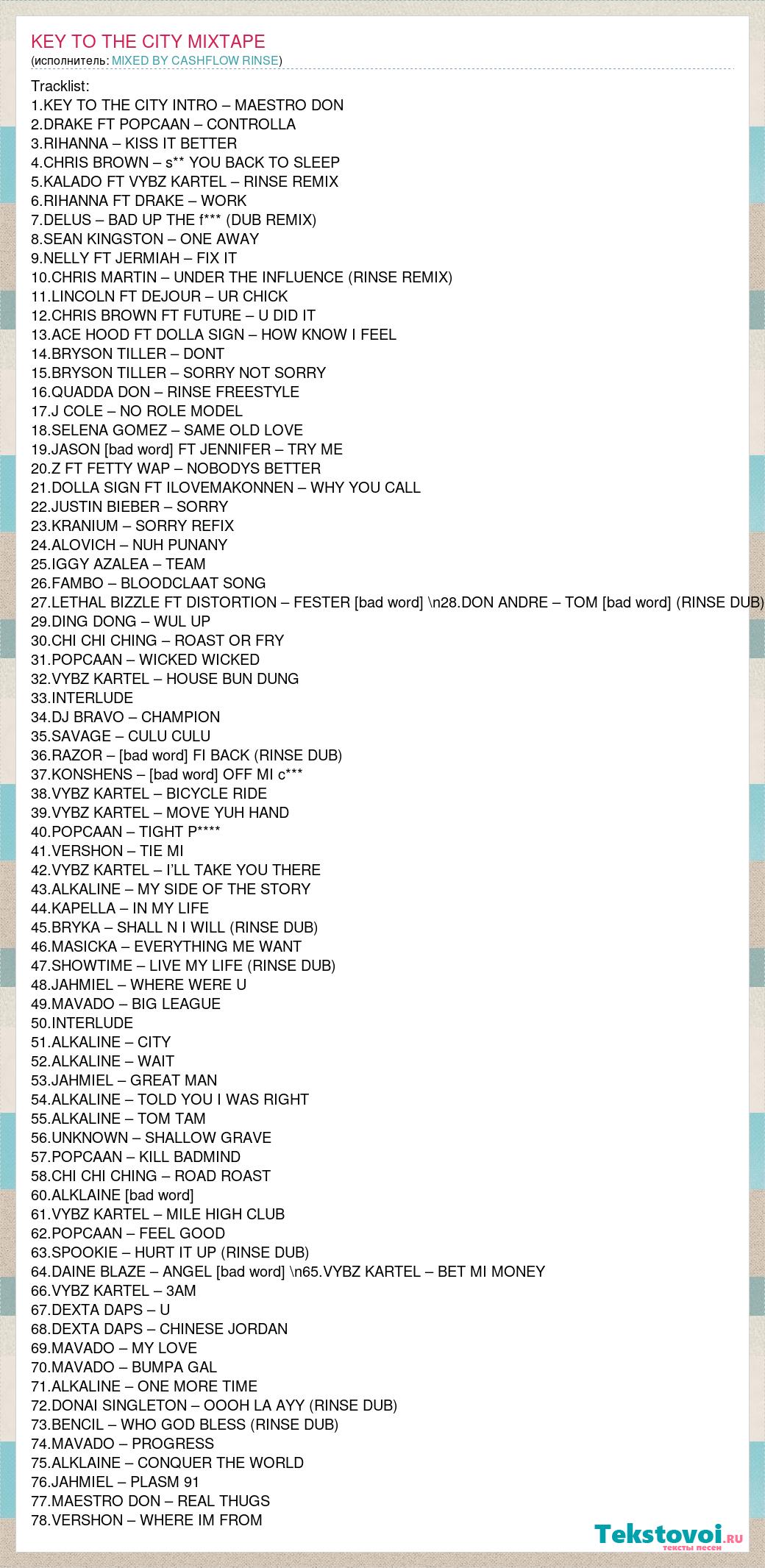 Tracklist: 1.KEY TO THE CITY INTRO – MAESTRO DON 2.DRAKE FT POPCAAN – CONTROLLA 3.RIHANNA – KISS IT BETTER 4.CHRIS BROWN – s** YOU BACK TO SLEEP 5.KALADO FT VYBZ KARTEL – RINSE REMIX 6.RIHANNA FT DRAKE – WORK 7.DELUS – BAD UP THE f*** (DUB REMIX) 8.SEAN KINGSTON – ONE AWAY 9.NELLY FT JERMIAH – FIX IT 10.CHRIS MARTIN – UNDER THE INFLUENCE (RINSE REMIX) 11.LINCOLN FT DEJOUR – UR CHICK 12.CHRIS BROWN FT FUTURE – U DID IT 13.ACE HOOD FT DOLLA SIGN – HOW KNOW I FEEL 14.BRYSON TILLER – DONT 15.BRYSON TILLER – SORRY NOT SORRY 16.QUADDA DON – RINSE FREESTYLE 17.J COLE – NO ROLE MODEL 18.SELENA GOMEZ – SAME OLD LOVE 19.JASON DERULO FT JENNIFER – TRY ME 20.Z FT FETTY WAP – NOBODYS BETTER 21.DOLLA SIGN FT ILOVEMAKONNEN – WHY YOU CALL 22.JUSTIN BIEBER – SORRY 23.KRANIUM – SORRY REFIX 24.ALOVICH – NUH PUNANY 25.IGGY AZALEA – TEAM 26.FAMBO – BLOODCLAAT SONG 27.LETHAL BIZZLE FT DISTORTION – FESTER [bad word] \n28.DON ANDRE – TOM CRUISE (RINSE DUB) 29.DING DONG – WUL UP 30.CHI CHI CHING – ROAST OR FRY 31.POPCAAN – WICKED WICKED 32.VYBZ KARTEL – HOUSE BUN DUNG 33.INTERLUDE 34.DJ BRAVO – CHAMPION 35.SAVAGE – CULU CULU 36.RAZOR – BRUK FI BACK (RINSE DUB) 37.KONSHENS – BRUK OFF MI c*** 38.VYBZ KARTEL – BICYCLE RIDE 39.VYBZ KARTEL – MOVE YUH HAND 40.POPCAAN – TIGHT P**** 41.VERSHON – TIE MI 42.VYBZ KARTEL – I’LL TAKE YOU THERE 43.ALKALINE – MY SIDE OF THE STORY 44.KAPELLA – IN MY LIFE 45.BRYKA – SHALL N I WILL (RINSE DUB) 46.MASICKA – EVERYTHING ME WANT 47.SHOWTIME – LIVE MY LIFE (RINSE DUB) 48.JAHMIEL – WHERE WERE U 49.MAVADO – BIG LEAGUE 50.INTERLUDE 51.ALKALINE – CITY 52.ALKALINE – WAIT 53.JAHMIEL – GREAT MAN 54.ALKALINE – TOLD YOU I WAS RIGHT 55.ALKALINE – TOM TAM 56.UNKNOWN – SHALLOW GRAVE 57.POPCAAN – KILL BADMIND 58.CHI CHI CHING – ROAD ROAST 60.ALKLAINE – COMPANY 61.VYBZ KARTEL – MILE HIGH CLUB 62.POPCAAN – FEEL GOOD 63.SPOOKIE – HURT IT UP (RINSE DUB) 64.DAINE BLAZE – ANGEL [bad word] \n65.VYBZ KARTEL – BET MI MONEY 66.VYBZ KARTEL – 3AM 67.DEXTA DAPS – U 68.DEXTA DAPS – CHINESE JORDAN 69.MAVADO – MY LOVE 70.MAVADO – BUMPA GAL 71.ALKALINE – ONE MORE TIME 72.DONAI SINGLETON – OOOH LA AYY (RINSE DUB) 73.BENCIL – WHO GOD BLESS (RINSE DUB) 74.MAVADO – PROGRESS 75.ALKLAINE – CONQUER THE WORLD 76.JAHMIEL – PLASM 91 77.MAESTRO DON – REAL THUGS 78.VERSHON – WHERE IM FROM