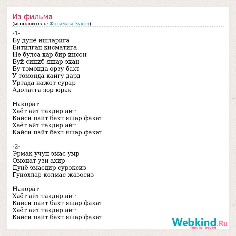 -1- Бу дунё ишларига Битилган кисматига Не булса хар бир инсон Буй синиб яшар экан Бу томонда орзу бахт У томонда кайгу дард Уртада нажот сурар Адолатга зор юрак Накорат Хаёт айт такдир айт Кайси пайт бахт яшар факат Хаёт айт такдир айт Кайси пайт бахт яшар факат -2- Эрмак учун эмас умр Омонат узи ахир Дунё эмасдир суроксиз Гунохлар колмас жазосиз Накорат Хаёт айт такдир айт Кайси пайт бахт яшар факат Хаёт айт такдир айт Кайси пайт бахт яшар факат