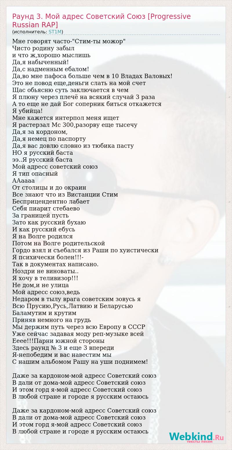 Мне говорят часто-"Стим-ты можор" Чисто родину забыл и что ж,хорошо мыслишь Да,я набыченный! Да,с надменным ебалом! Да,во мне пафоса больше чем в 10 Владах Валовых! Это не повод еще,деньги слать на мой счет Щас обьясню суть заключается в чем Я плюну через плечё на всякий случай 3 раза А то еще не дай Бог соперник биться откажется Я убийца! Мне кажется интерпол меня ищет Я растерзал Мс 300,разорву еще тысечу Да,я за кордоном, Да,я немец по паспорту Да,я вас довлю словно из тюбика пасту НО я русский баста ээ..Я русский баста Мой адресс советский союз Я тип опасный ААаааа От столицы и до окраин Все знают что из Вистанции Стим Бесприцендентно лабает Себя пиарит стебаево За границей пусть Зато как русский бухаю И как русский ебусь Я на Волге родился Потом на Волге родительской Гордо взял и съебался из Раши по хуистически Я психически болен!!!- Так в документах написано. Ноздри не виноваты.. Я хочу в теливизор!!! Не дом,и не улица Мой адресс союз,ведь Недаром в тылу врага советским зовусь я Всю Прусию,Русь,Латвию и Беларусью Баламутим и крутим Приняв немного на грудь Мы держим путь через всю Европу в СССР Уже сейчас задавая моду реп-музыке всей Ееее!!!Парни южной стороны Здесь раунд № 3 и еще 3 впереди Я-непобедим и вас навестим мы С нашим альбомом Рашу на уши поднимем! Даже за кардоном-мой адресс Советский союз В дали от дома-мой адресс Советский союз И этом горд я-мой адресс Советский союз В любой стране и городе я русским остаюсь Даже за кардоном-мой адресс Советский союз В дали от дома-мой адресс Советский союз И этом горд я-мой адресс Советский союз В любой стране и городе я русским остаюсь