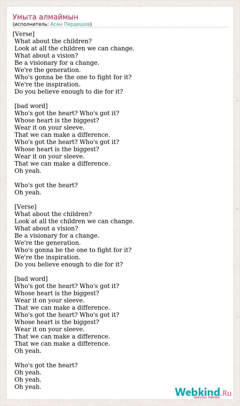 [Verse] What about the children? Look at all the children we can change. What about a vision? Be a visionary for a change. We're the generation. Who's gonna be the one to fight for it? We're the inspiration. Do you believe enough to die for it? [bad word] Who's got the heart? Who's got it? Whose heart is the biggest? Wear it on your sleeve. That we can make a difference. Who's got the heart? Who's got it? Whose heart is the biggest? Wear it on your sleeve. That we can make a difference. Oh yeah. Who's got the heart? Oh yeah. [Verse] What about the children? Look at all the children we can change. What about a vision? Be a visionary for a change. We're the generation. Who's gonna be the one to fight for it? We're the inspiration. Do you believe enough to die for it? [bad word] Who's got the heart? Who's got it? Whose heart is the biggest? Wear it on your sleeve. That we can make a difference. Who's got the heart? Who's got it? Whose heart is the biggest? Wear it on your sleeve. That we can make a difference. That we can make a difference. Oh yeah. Who's got the heart? Oh yeah. Oh yeah. Oh yeah.