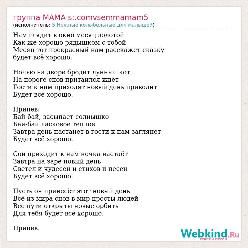 Нам глядит в окно месяц золотой Как же хорошо рядышком с тобой Месяц тот прекрасный нам расскажет сказку будет всё хорошо. Ночью на дворе бродит лунный кот На пороге снов притаился ждёт Гости к нам приходят новый день приводит Будет всё хорошо. Припев: Бай-бай, засыпает солнышко Бай-бай ласковое теплое Завтра день настанет в гости к нам заглянет Будет всё хорошо. Сон приходит к нам ночка настаёт Завтра на заре новый день Светел и чудесен и стихов и песен Будет всё хорошо. Пусть он принесёт этот новый день Всё из мира снов в мир просты людей Все пути открыты новые орбиты Для тебя будет всё хорошо. Припев.