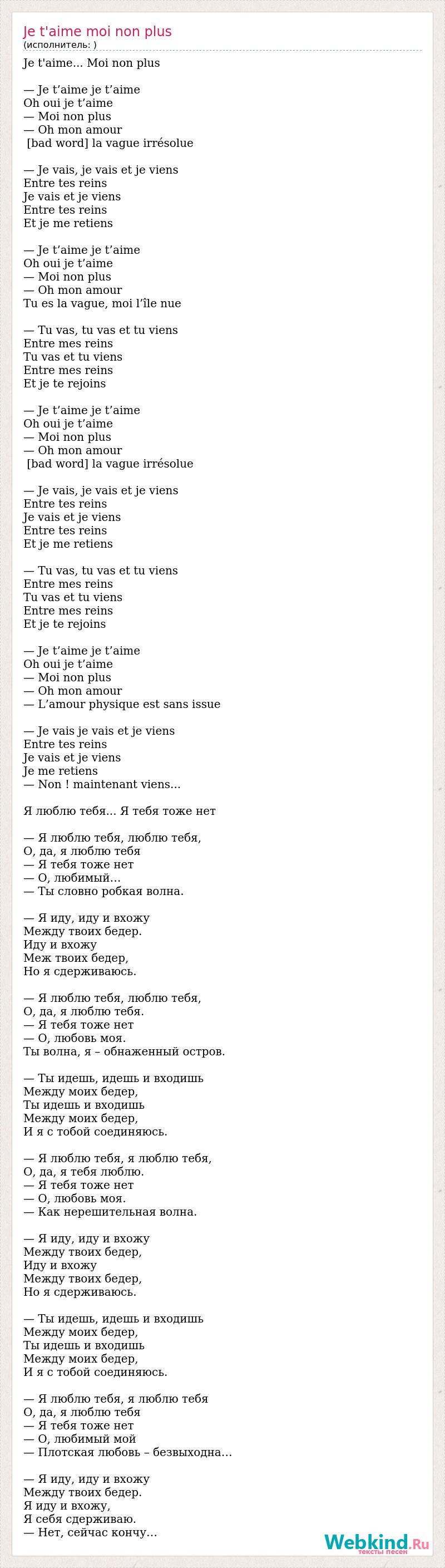Je t'aime... Moi non plus — Je t’aime je t’aime Oh oui je t’aime — Moi non plus — Oh mon amour [bad word] la vague irrésolue — Je vais, je vais et je viens Entre tes reins Je vais et je viens Entre tes reins Et je me retiens — Je t’aime je t’aime Oh oui je t’aime — Moi non plus — Oh mon amour Tu es la vague, moi l’île nue — Tu vas, tu vas et tu viens Entre mes reins Tu vas et tu viens Entre mes reins Et je te rejoins — Je t’aime je t’aime Oh oui je t’aime — Moi non plus — Oh mon amour [bad word] la vague irrésolue — Je vais, je vais et je viens Entre tes reins Je vais et je viens Entre tes reins Et je me retiens — Tu vas, tu vas et tu viens Entre mes reins Tu vas et tu viens Entre mes reins Et je te rejoins — Je t’aime je t’aime Oh oui je t’aime — Moi non plus — Oh mon amour — L’amour physique est sans issue — Je vais je vais et je viens Entre tes reins Je vais et je viens Je me retiens — Non ! maintenant viens... Я люблю тебя... Я тебя тоже нет — Я люблю тебя, люблю тебя, О, да, я люблю тебя — Я тебя тоже нет — О, любимый… — Ты словно робкая волна. — Я иду, иду и вхожу Между твоих бедер. Иду и вхожу Меж твоих бедер, Но я сдерживаюсь. — Я люблю тебя, люблю тебя, О, да, я люблю тебя. — Я тебя тоже нет — О, любовь моя. Ты волна, я – обнаженный остров. — Ты идешь, идешь и входишь Между моих бедер, Ты идешь и входишь Между моих бедер, И я с тобой соединяюсь. — Я люблю тебя, я люблю тебя, О, да, я тебя люблю. — Я тебя тоже нет — О, любовь моя. — Как нерешительная волна. — Я иду, иду и вхожу Между твоих бедер, Иду и вхожу Между твоих бедер, Но я сдерживаюсь. — Ты идешь, идешь и входишь Между моих бедер, Ты идешь и входишь Между моих бедер, И я с тобой соединяюсь. — Я люблю тебя, я люблю тебя О, да, я люблю тебя — Я тебя тоже нет — О, любимый мой — Плотская любовь – безвыходна… — Я иду, иду и вхожу Между твоих бедер. Я иду и вхожу, Я себя сдерживаю. — Нет, сейчас кончу…