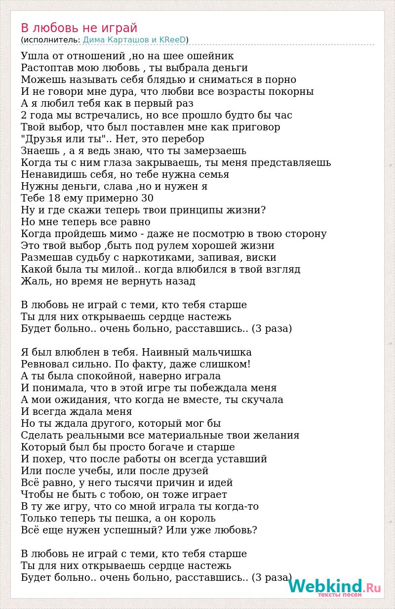 Ушла от отношений ,но на шее ошейник Растоптав мою любовь , ты выбрала деньги Можешь называть себя блядью и сниматься в порно И не говори мне дура, что любви все возрасты покорны А я любил тебя как в первый раз 2 года мы встречались, но все прошло будто бы час Твой выбор, что был поставлен мне как приговор "Друзья или ты".. Нет, это перебор Знаешь , а я ведь знаю, что ты замерзаешь Когда ты с ним глаза закрываешь, ты меня представляешь Ненавидишь себя, но тебе нужна семья Нужны деньги, слава ,но и нужен я Тебе 18 ему примерно 30 Ну и где скажи теперь твои принципы жизни? Но мне теперь все равно Когда пройдешь мимо - даже не посмотрю в твою сторону Это твой выбор ,быть под рулем хорошей жизни Размешав судьбу с наркотиками, запивая, виски Какой была ты милой.. когда влюбился в твой взгляд Жаль, но время не вернуть назад В любовь не играй с теми, кто тебя старше Ты для них открываешь сердце настежь Будет больно.. очень больно, расставшись.. (3 раза) Я был влюблен в тебя. Наивный мальчишка Ревновал сильно. По факту, даже слишком! А ты была спокойной, наверно играла И понимала, что в этой игре ты побеждала меня А мои ожидания, что когда не вместе, ты скучала И всегда ждала меня Но ты ждала другого, который мог бы Сделать реальными все материальные твои желания Который был бы просто богаче и старше И похер, что после работы он всегда уставший Или после учебы, или после друзей Всё равно, у него тысячи причин и идей Чтобы не быть с тобою, он тоже играет В ту же игру, что со мной играла ты когда-то Только теперь ты пешка, а он король Всё еще нужен успешный? Или уже любовь? В любовь не играй с теми, кто тебя старше Ты для них открываешь сердце настежь Будет больно.. очень больно, расставшись.. (3 раза)