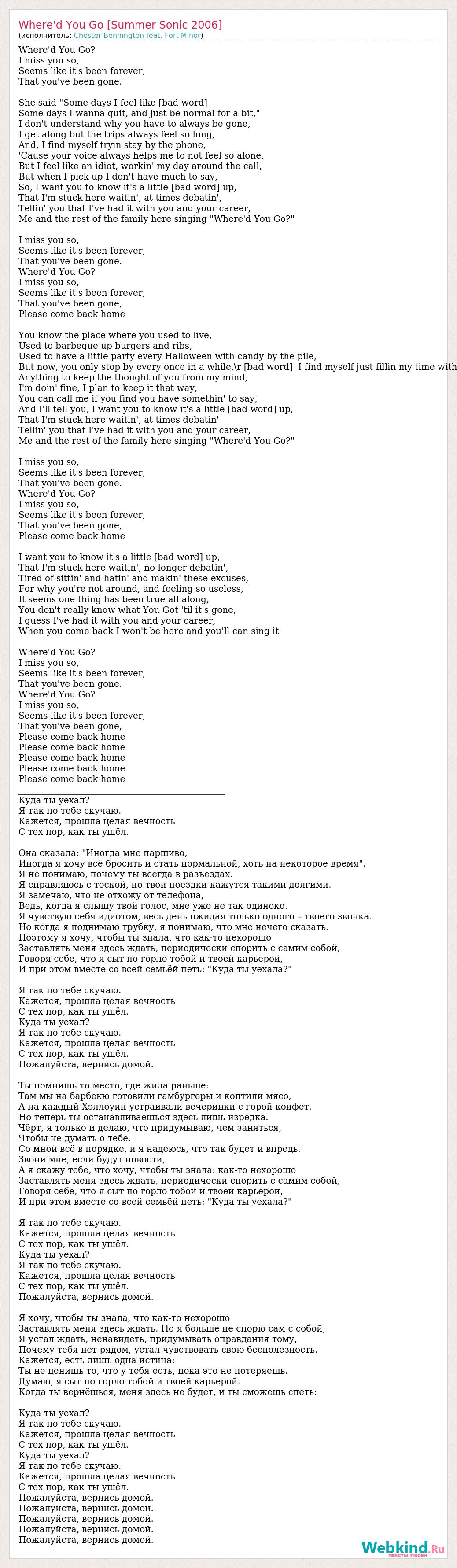 Where'd You Go? I miss you so, Seems like it's been forever, That you've been gone. She said "Some days I feel like [bad word] Some days I wanna quit, and just be normal for a bit," I don't understand why you have to always be gone, I get along but the trips always feel so long, And, I find myself tryin stay by the phone, 'Cause your voice always helps me to not feel so alone, But I feel like an idiot, workin' my day around the call, But when I pick up I don't have much to say, So, I want you to know it's a little [bad word] up, That I'm stuck here waitin', at times debatin', Tellin' you that I've had it with you and your career, Me and the rest of the family here singing "Where'd You Go?" I miss you so, Seems like it's been forever, That you've been gone. Where'd You Go? I miss you so, Seems like it's been forever, That you've been gone, Please come back home You know the place where you used to live, Used to barbeque up burgers and ribs, Used to have a little party every Halloween with candy by the pile, But now, you only stop by every once in a while,\r [bad word] I find myself just fillin my time with Anything to keep the thought of you from my mind, I'm doin' fine, I plan to keep it that way, You can call me if you find you have somethin' to say, And I'll tell you, I want you to know it's a little [bad word] up, That I'm stuck here waitin', at times debatin' Tellin' you that I've had it with you and your career, Me and the rest of the family here singing "Where'd You Go?" I miss you so, Seems like it's been forever, That you've been gone. Where'd You Go? I miss you so, Seems like it's been forever, That you've been gone, Please come back home I want you to know it's a little [bad word] up, That I'm stuck here waitin', no longer debatin', Tired of sittin' and hatin' and makin' these excuses, For why you're not around, and feeling so useless, It seems one thing has been true all along, You don't really know what You Got 'til it's gone, I guess I've had it with you and your career, When you come back I won't be here and you'll can sing it Where'd You Go? I miss you so, Seems like it's been forever, That you've been gone. Where'd You Go? I miss you so, Seems like it's been forever, That you've been gone, Please come back home Please come back home Please come back home Please come back home Please come back home _______________________________________________ Куда ты уехал? Я так по тебе скучаю. Кажется, прошла целая вечность С тех пор, как ты ушёл. Она сказала: "Иногда мне паршиво, Иногда я хочу всё бросить и стать нормальной, хоть на некоторое время". Я не понимаю, почему ты всегда в разъездах. Я справляюсь с тоской, но твои поездки кажутся такими долгими. Я замечаю, что не отхожу от телефона, Ведь, когда я слышу твой голос, мне уже не так одиноко. Я чувствую себя идиотом, весь день ожидая только одного – твоего звонка. Но когда я поднимаю трубку, я понимаю, что мне нечего сказать. Поэтому я хочу, чтобы ты знала, что как-то нехорошо Заставлять меня здесь ждать, периодически спорить с самим собой, Говоря себе, что я сыт по горло тобой и твоей карьерой, И при этом вместе со всей семьёй петь: "Куда ты уехала?" Я так по тебе скучаю. Кажется, прошла целая вечность С тех пор, как ты ушёл. Куда ты уехал? Я так по тебе скучаю. Кажется, прошла целая вечность С тех пор, как ты ушёл. Пожалуйста, вернись домой. Ты помнишь то место, где жила раньше: Там мы на барбекю готовили гамбургеры и коптили мясо, А на каждый Хэллоуин устраивали вечеринки с горой конфет. Но теперь ты останавливаешься здесь лишь изредка. Чёрт, я только и делаю, что придумываю, чем заняться, Чтобы не думать о тебе. Со мной всё в порядке, и я надеюсь, что так будет и впредь. Звони мне, если будут новости, А я скажу тебе, что хочу, чтобы ты знала: как-то нехорошо Заставлять меня здесь ждать, периодически спорить с самим собой, Говоря себе, что я сыт по горло тобой и твоей карьерой, И при этом вместе со всей семьёй петь: "Куда ты уехала?" Я так по тебе скучаю. Кажется, прошла целая вечность С тех пор, как ты ушёл. Куда ты уехал? Я так по тебе скучаю. Кажется, прошла целая вечность С тех пор, как ты ушёл. Пожалуйста, вернись домой. Я хочу, чтобы ты знала, что как-то нехорошо Заставлять меня здесь ждать. Но я больше не спорю сам с собой, Я устал ждать, ненавидеть, придумывать оправдания тому, Почему тебя нет рядом, устал чувствовать свою бесполезность. Кажется, есть лишь одна истина: Ты не
