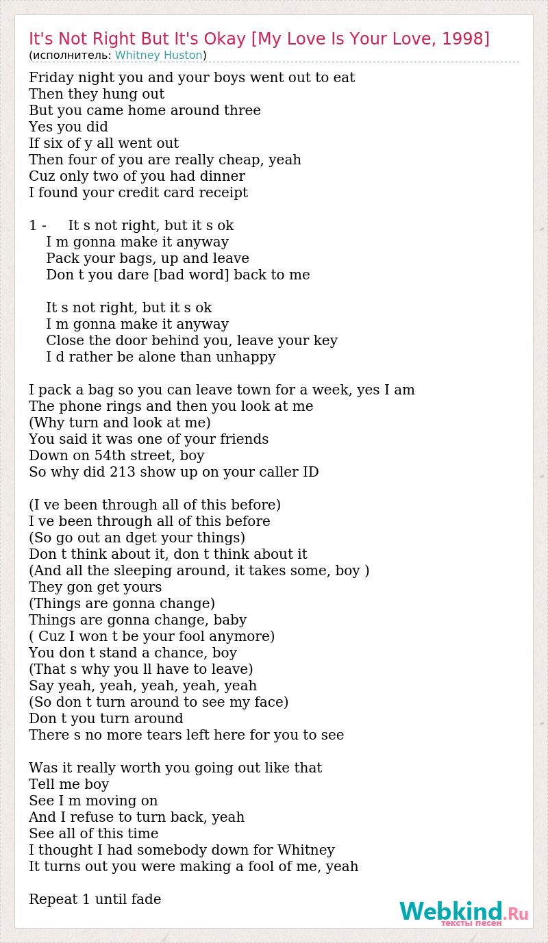 А как ты думаешь, о чем песня "It's Not Right But It's Okay [My Love Is Your Love, 1998]" ?