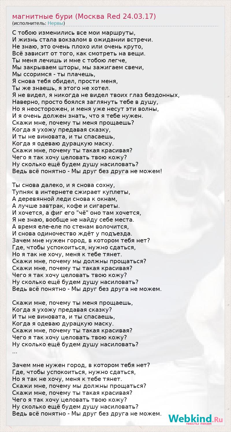 С тобою изменились все мои маршруты, И жизнь стала вокзалом в ожидании встречи. Не знаю, это очень плохо или очень круто, Всё зависит от того, как смотреть на вещи. Ты меня лечишь и мне с тобою легче, Мы закрываем шторы, мы зажигаем свечи, Мы ссоримся - ты плачешь, Я снова тебя обидел, прости меня, Ты же знаешь, я этого не хотел. Я не видел, я никогда не видел твоих глаз бездонных, Наверно, просто боялся заглянуть тебе в душу, Но я неосторожен, и меня уже несут эти волны, И я очень должен знать, что я тебе нужен. Скажи мне, почему ты меня прощаешь? Когда я ухожу предавая сказку, И ты не виновата, и ты спасаешь, Когда я одеваю дурацкую маску. Скажи мне, почему ты такая красивая? Чего я так хочу целовать твою кожу? Ну сколько ещё будем душу насиловать? Ведь всё понятно - Мы друг без друга не можем! Ты снова далеко, и я снова сохну, Тупняк в интернете сжирает куплеты, А деревянной леди снова к окнам, А лучше завтрак, кофе и сигареты. И хочется, а фиг его "чё" оно там хочется, Я не знаю, вообще не найду себе места. А время еле-еле по стенам волочится, И снова одиночество ждёт у подъезда. Зачем мне нужен город, в котором тебя нет? Где, чтобы успокоиться, нужно сдаться, Но я так не хочу, меня к тебе тянет. Скажи мне, почему мы должны прощаться? Скажи мне, почему ты такая красивая? Чего я так хочу целовать твою кожу? Ну сколько ещё будем душу насиловать? Ведь всё понятно - Мы друг без друга не можем. Скажи мне, почему ты меня прощаешь, Когда я ухожу предавая сказку? И ты не виновата, и ты спасаешь, Когда я одеваю дурацкую маску. Скажи мне, почему ты такая красивая? Чего я так хочу целовать твою кожу? Ну сколько ещё будем душу насиловать? ... Зачем мне нужен город, в котором тебя нет? Где, чтобы успокоиться, нужно сдаться, Но я так не хочу, меня к тебе тянет. Скажи мне, почему мы должны прощаться? Скажи мне, почему ты такая красивая? Чего я так хочу целовать твою кожу? Ну сколько ещё будем душу насиловать? Ведь всё понятно - Мы друг без друга не можем.