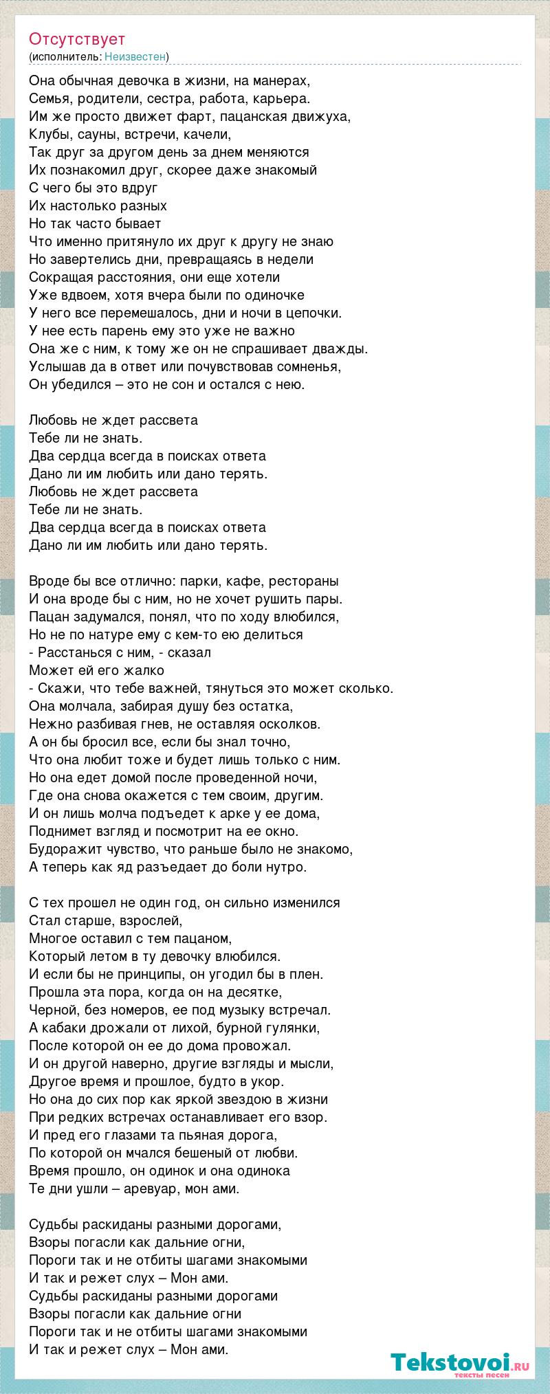 Она обычная девочка в жизни, на манерах, Семья, родители, сестра, работа, карьера. Им же просто движет фарт, пацанская движуха, Клубы, сауны, встречи, качели, Так друг за другом день за днем меняются Их познакомил друг, скорее даже знакомый С чего бы это вдруг Их настолько разных Но так часто бывает Что именно притянуло их друг к другу не знаю Но завертелись дни, превращаясь в недели Сокращая расстояния, они еще хотели Уже вдвоем, хотя вчера были по одиночке У него все перемешалось, дни и ночи в цепочки. У нее есть парень ему это уже не важно Она же с ним, к тому же он не спрашивает дважды. Услышав да в ответ или почувствовав сомненья, Он убедился – это не сон и остался с нею. Любовь не ждет рассвета Тебе ли не знать. Два сердца всегда в поисках ответа Дано ли им любить или дано терять. Любовь не ждет рассвета Тебе ли не знать. Два сердца всегда в поисках ответа Дано ли им любить или дано терять. Вроде бы все отлично: парки, кафе, рестораны И она вроде бы с ним, но не хочет рушить пары. Пацан задумался, понял, что по ходу влюбился, Но не по натуре ему с кем-то ею делиться - Расстанься с ним, - сказал Может ей его жалко - Скажи, что тебе важней, тянуться это может сколько. Она молчала, забирая душу без остатка, Нежно разбивая гнев, не оставляя осколков. А он бы бросил все, если бы знал точно, Что она любит тоже и будет лишь только с ним. Но она едет домой после проведенной ночи, Где она снова окажется с тем своим, другим. И он лишь молча подъедет к арке у ее дома, Поднимет взгляд и посмотрит на ее окно. Будоражит чувство, что раньше было не знакомо, А теперь как яд разъедает до боли нутро. С тех прошел не один год, он сильно изменился Стал старше, взрослей, Многое оставил с тем пацаном, Который летом в ту девочку влюбился. И если бы не принципы, он угодил бы в плен. Прошла эта пора, когда он на десятке, Черной, без номеров, ее под музыку встречал. А кабаки дрожали от лихой, бурной гулянки, После которой он ее до дома провожал. И он другой наверно, другие взгляды и мысли, Другое время и прошлое, будто в укор. Но она до сих пор как яркой звездою в жизни При редких встречах останавливает его взор. И пред его глазами та пьяная дорога, По которой он мчался бешеный от любви. Время прошло, он одинок и она одинока Те дни ушли – аревуар, мон ами. Судьбы раскиданы разными дорогами, Взоры погасли как дальние огни, Пороги так и не отбиты шагами знакомыми И так и режет слух – Мон ами. Судьбы раскиданы разными дорогами Взоры погасли как дальние огни Пороги так и не отбиты шагами знакомыми И так и режет слух – Мон ами.