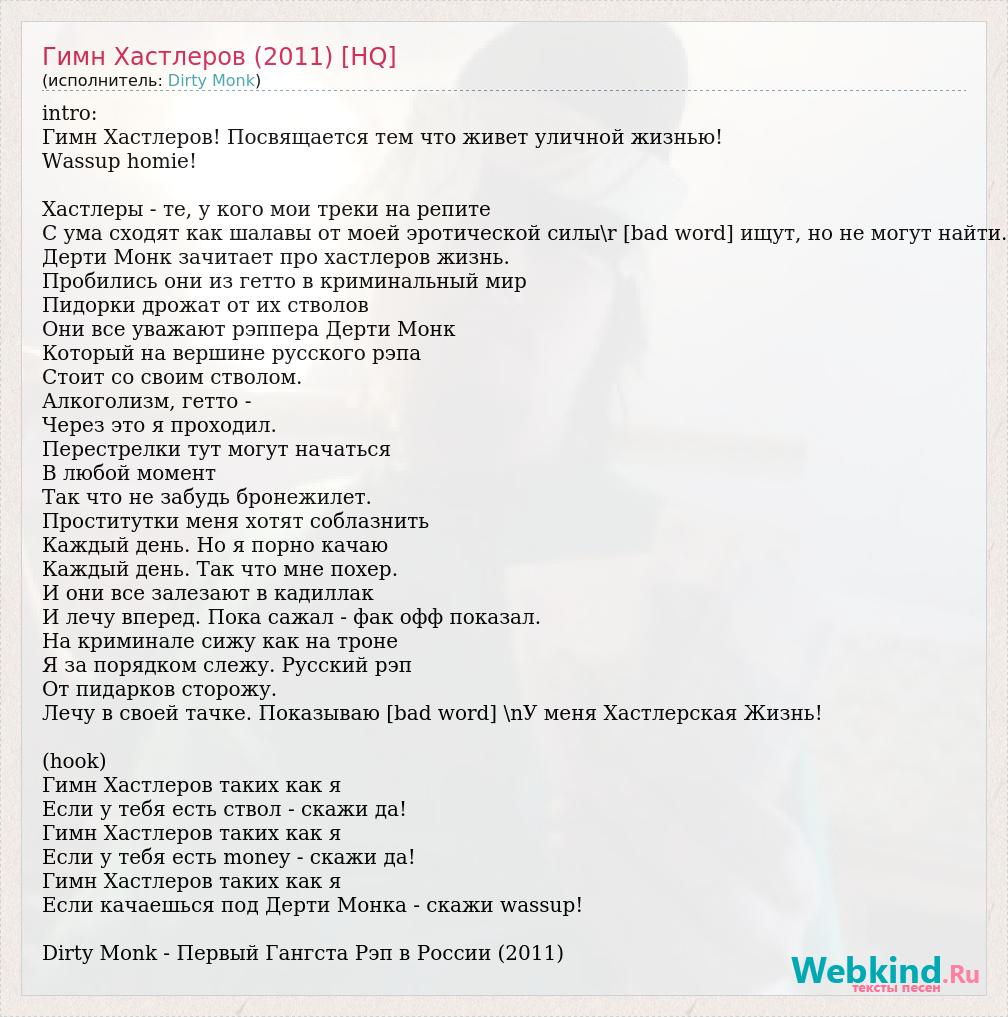 intro: Гимн Хастлеров! Посвящается тем что живет уличной жизнью! Wassup homie! Хастлеры - те, у кого мои треки на репите С ума сходят как шалавы от моей эротической силы\r [bad word] ищут, но не могут найти. Дерти Монк зачитает про хастлеров жизнь. Пробились они из гетто в криминальный мир Пидорки дрожат от их стволов Они все уважают рэппера Дерти Монк Который на вершине русского рэпа Стоит со своим стволом. Алкоголизм, гетто - Через это я проходил. Перестрелки тут могут начаться В любой момент Так что не забудь бронежилет. Проститутки меня хотят соблазнить Каждый день. Но я порно качаю Каждый день. Так что мне похер. И они все залезают в кадиллак И лечу вперед. Пока сажал - фак офф показал. На криминале сижу как на троне Я за порядком слежу. Русский рэп От пидарков сторожу. Лечу в своей тачке. Показываю [bad word] \nУ меня Хастлерская Жизнь! (hook) Гимн Хастлеров таких как я Если у тебя есть ствол - скажи да! Гимн Хастлеров таких как я Если у тебя есть money - скажи да! Гимн Хастлеров таких как я Если качаешься под Дерти Монка - скажи wassup! Dirty Monk - Первый Гангста Рэп в России (2011)