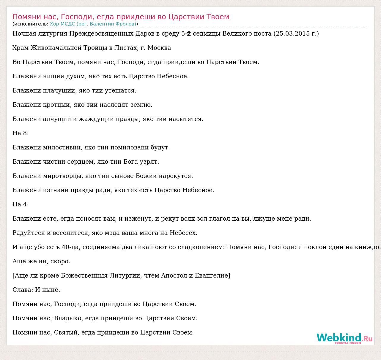 Ночная литургия Преждеосвященных Даров в среду 5-й седмицы Великого поста (25.03.2015 г.) Храм Живоначальной Троицы в Листах, г. Москва Во Царствии Твоем, помяни нас, Господи, егда приидеши во Царствии Твоем. Блажени нищии духом, яко тех есть Царство Небесное. Блажени плачущии, яко тии утешатся. Блажени кротцыи, яко тии наследят землю. Блажени алчущии и жаждущии правды, яко тии насытятся. На 8: Блажени милостивии, яко тии помиловани будут. Блажени чистии сердцем, яко тии Бога узрят. Блажени миротворцы, яко тии сынове Божии нарекутся. Блажени изгнани правды ради, яко тех есть Царство Небесное. На 4: Блажени есте, егда поносят вам, и изженут, и рекут всяк зол глагол на вы, лжуще мене ради. Радуйтеся и веселитеся, яко мзда ваша многа на Небесех. И аще убо есть 40-ца, соединяема два лика поют со сладкопением: Помяни нас, Господи: и поклон един на кийждо. Аще же ни, скоро. [Аще ли кроме Божественныя Литургии, чтем Апостол и Евангелие] Слава: И ныне. Помяни нас, Господи, егда приидеши во Царствии Своем. Помяни нас, Владыко, егда приидеши во Царствии Своем. Помяни нас, Святый, егда приидеши во Царствии Своем.