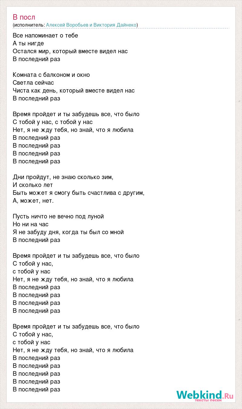 Все напоминает о тебе А ты нигде Остался мир, который вместе видел нас В последний раз Комната с балконом и окно Светла сейчас Чиста как день, который вместе видел нас В последний раз Время пройдет и ты забудешь все, что было С тобой у нас, с тобой у нас Нет, я не жду тебя, но знай, что я любила В последний раз В последний раз В последний раз В последний раз Дни пройдут, не знаю сколько зим, И сколько лет Быть может я смогу быть счастлива с другим, А, может, нет. Пусть ничто не вечно под луной Но ни на час Я не забуду дня, когда ты был со мной В последний раз Время пройдет и ты забудешь все, что было С тобой у нас, с тобой у нас Нет, я не жду тебя, но знай, что я любила В последний раз В последний раз В последний раз В последний раз Время пройдет и ты забудешь все, что было С тобой у нас, с тобой у нас Нет, я не жду тебя, но знай, что я любила В последний раз В последний раз В последний раз В последний раз В последний раз