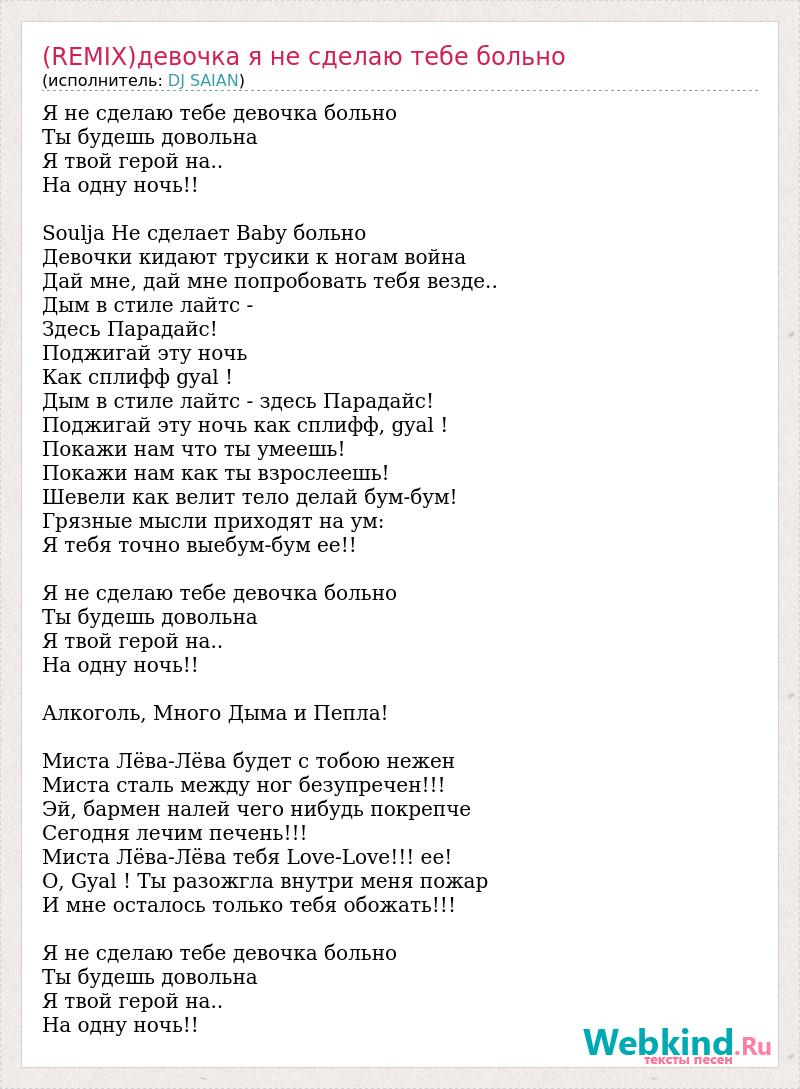Я не сделаю тебе девочка больно Ты будешь довольна Я твой герой на.. На одну ночь!! Soulja Не сделает Baby больно Девочки кидают трусики к ногам война Дай мне, дай мне попробовать тебя везде.. Дым в стиле лайтс - Здесь Парадайс! Поджигай эту ночь Как сплифф gyal ! Дым в стиле лайтс - здесь Парадайс! Поджигай эту ночь как сплифф, gyal ! Покажи нам что ты умеешь! Покажи нам как ты взрослеешь! Шевели как велит тело делай бум-бум! Грязные мысли приходят на ум: Я тебя точно выебум-бум ее!! Я не сделаю тебе девочка больно Ты будешь довольна Я твой герой на.. На одну ночь!! Алкоголь, Много Дыма и Пепла! Миста Лёва-Лёва будет с тобою нежен Миста сталь между ног безупречен!!! Эй, бармен налей чего нибудь покрепче Сегодня лечим печень!!! Миста Лёва-Лёва тебя Love-Love!!! ее! O, Gyal ! Ты разожгла внутри меня пожар И мне осталось только тебя обожать!!! Я не сделаю тебе девочка больно Ты будешь довольна Я твой герой на.. На одну ночь!!