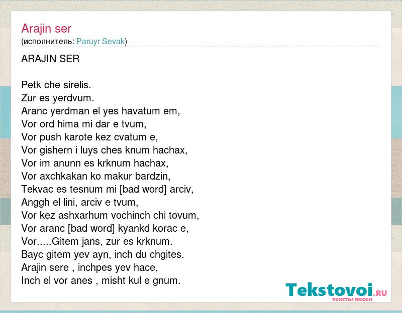 ARAJIN SER Petk che sirelis. Zur es yerdvum. Aranc yerdman el yes havatum em, Vor ord hima mi dar e tvum, Vor push karote kez cvatum e, Vor gishern i luys ches knum hachax, Vor im anunn es krknum hachax, Vor axchkakan ko makur bardzin, Tekvac es tesnum mi [bad word] arciv, Anggh el lini, arciv e tvum, Vor kez ashxarhum vochinch chi tovum, Vor aranc [bad word] kyankd korac e, Vor.....Gitem jans, zur es krknum. Bayc gitem yev ayn, inch du chgites. Arajin sere , inchpes yev hace, Inch el vor anes , misht kul e gnum.