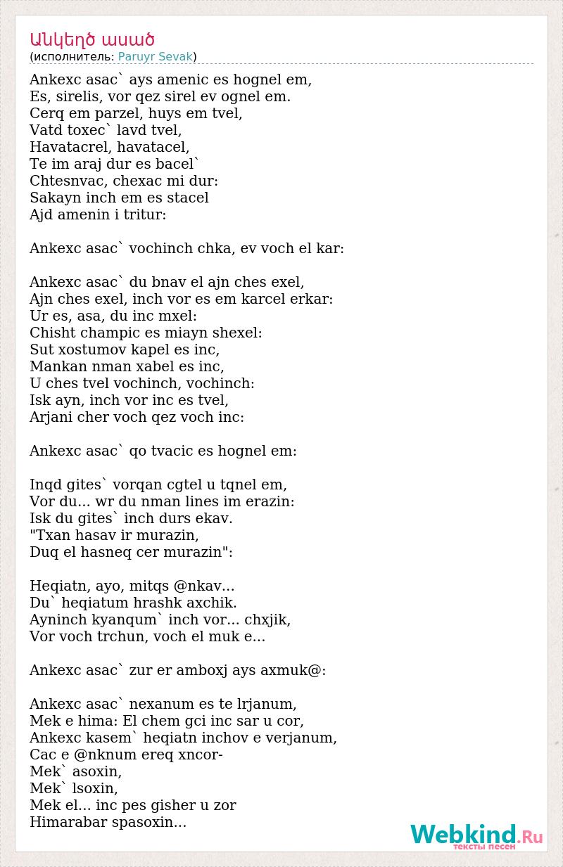 Ankexc asac` ays amenic es hognel em, Es, sirelis, vor qez sirel ev ognel em. Cerq em parzel, huys em tvel, Vatd toxec` lavd tvel, Havatacrel, havatacel, Te im araj dur es bacel` Chtesnvac, chexac mi dur: Sakayn inch em es stacel Ajd amenin i tritur: Ankexc asac` vochinch chka, ev voch el kar: Ankexc asac` du bnav el ajn ches exel, Ajn ches exel, inch vor es em karcel erkar: Ur es, asa, du inc mxel: Chisht champic es miayn shexel: Sut xostumov kapel es inc, Mankan nman xabel es inc, U ches tvel vochinch, vochinch: Isk ayn, inch vor inc es tvel, Arjani cher voch qez voch inc: Ankexc asac` qo tvacic es hognel em: Inqd gites` vorqan cgtel u tqnel em, Vor du... wr du nman lines im erazin: Isk du gites` inch durs ekav. "Txan hasav ir murazin, Duq el hasneq cer murazin": Heqiatn, ayo, mitqs @nkav... Du` heqiatum hrashk axchik. Ayninch kyanqum` inch vor... chxjik, Vor voch trchun, voch el muk e... Ankexc asac` zur er amboxj ays axmuk@: Ankexc asac` nexanum es te lrjanum, Mek e hima: El chem gci inc sar u cor, Ankexc kasem` heqiatn inchov e verjanum, Cac e @nknum ereq xncor- Mek` asoxin, Mek` lsoxin, Mek el... inc pes gisher u zor Himarabar spasoxin...
