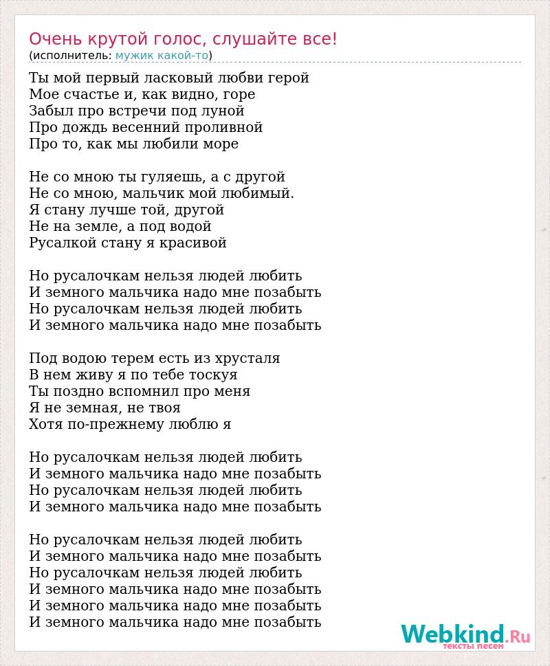 Ты мой первый ласковый любви герой Мое счастье и, как видно, горе Забыл про встречи под луной Про дождь весенний проливной Про то, как мы любили море Не со мною ты гуляешь, а с другой Не со мною, мальчик мой любимый. Я стану лучше той, другой Не на земле, а под водой Русалкой стану я красивой Но русалочкам нельзя людей любить И земного мальчика надо мне позабыть Но русалочкам нельзя людей любить И земного мальчика надо мне позабыть Под водою терем есть из хрусталя В нем живу я по тебе тоскуя Ты поздно вспомнил про меня Я не земная, не твоя Хотя по-прежнему люблю я Но русалочкам нельзя людей любить И земного мальчика надо мне позабыть Но русалочкам нельзя людей любить И земного мальчика надо мне позабыть Но русалочкам нельзя людей любить И земного мальчика надо мне позабыть Но русалочкам нельзя людей любить И земного мальчика надо мне позабыть И земного мальчика надо мне позабыть И земного мальчика надо мне позабыть