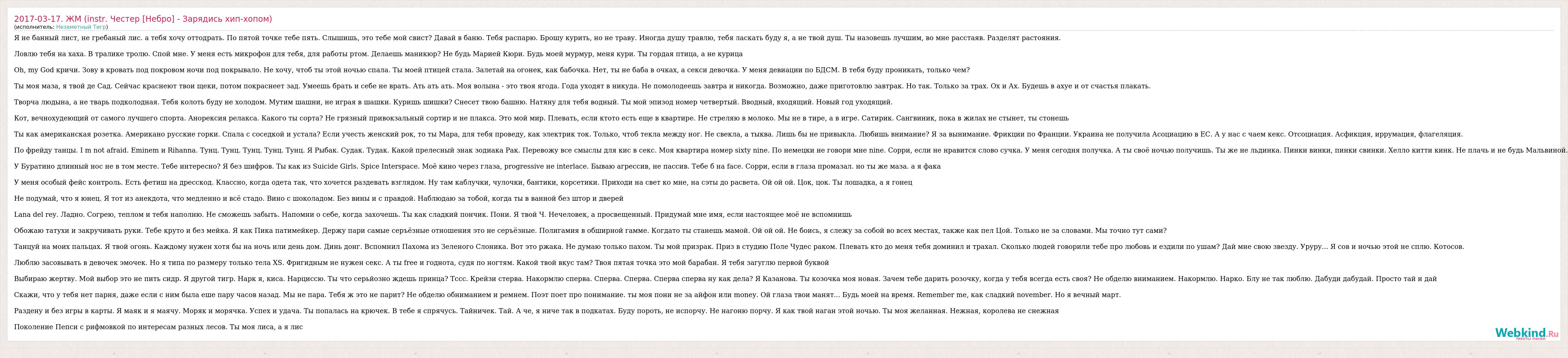 А как ты думаешь, о чем песня "2017-03-17. ЖМ (instr. Честер [Небро] - Зарядись хип-хопом)" ?