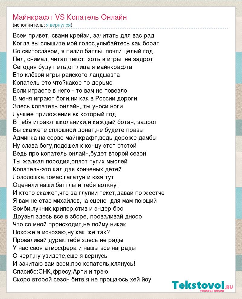 Всем привет, свами крейзи, зачитать для вас рад Когда вы слышите мой голос,улыбайтесь как борат Со свитославом, я пилил батлы, почти целый год Пел, снимал, читал текст, хоть в игры не задрот Сегодня буду петь,от лица я майнкрафта Ето клёвой игры райского ландшавта Копатель ето что?какое то дерьмо Если играете в него - то вам не повезло В меня играют боги,ни как в России дороги Здесь копатель онлайн, ты уноси ноги Лучшее приложения вк который год В тебя играют школьники,и каждый ботан, задрот Вы скажете сплошной донат,не будете правы Админка на серве майнкрафт,ведь дороже дамбы Ну слава богу,подошел к концу этот отстой Ведь про копатель онлайн,будет второй сезон Ты жалкая породия,оплот тугих мыслей Копатель-это кал для конченых детей Лололошка,томас,гагатун и юзя тут Оценили наши баттлы и тебя воткнут И ктото скажет,что за глупий текст,давай по жестче Я вам не стас михайлов,на сцене для мам поющий Зомби,лучник,крипер,стив и эндер бро Друзья здесь все в зборе, проваливай днооо Что со мной происходит,не пойму никак Похоже я исчозаю,ну как же так? Проваливай дурак,тебе здесь не рады У нас своя атмосфера и нашы все награды О черт,ну увидете,еще я вернусь И зачитаю вам всем,про копатель,клянусь! Спасибо:СНК,фресу,Арти и трэю Скоро второй сезон битв,я не прощаюсь хей йоу