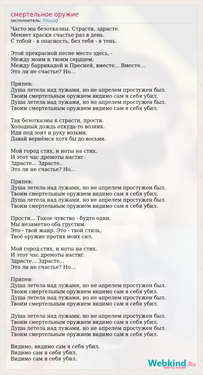 Часто мы безотказны. Страсти, здрасте. Меняет краски счастье раз в день. С тобой - в опасность, без тебя - в тень. Этой прекрасной песне место здесь, - Между моим и твоим сердцем, Между баррикадой и Пресней, вместе... Вместе... Это ли не счастье? Но... Припев: Душа летела над лужами, но не апрелем простужен был. Твоим смертельным оружием видимо сам я себя убил. Душа летела над лужами, но не апрелем простужен был. Твоим смертельным оружием видимо сам я себя убил. Так безотказны к страсти, прости. Холодный дождь откуда-то возник. Иди под зонт и руку возьми, Давай вернёмся хотя бы до восьми. Мой город стих, и ноты на стих. И этот час дремоты настиг. Здрасте... Здрасте.. Это ли не счастье? Но... Припев: Душа летела над лужами, но не апрелем простужен был. Твоим смертельным оружием видимо сам я себя убил. Душа летела над лужами, но не апрелем простужен был. Твоим смертельным оружием видимо сам я себя убил. Прости... Такое чувство - будто один. Мы незаметно оба грустим. Это - твой жанр. Это - твой стиль, Твоё оружие против моих сил. Мой город стих, и ноты на стих. И этот час дремоты настиг. Здрасте... Здрасте... Это ли не счастье? Но... Припев: Душа летела над лужами, но не апрелем простужен был. Твоим смертельным оружием видимо сам я себя убил. Душа летела над лужами, но не апрелем простужен был. Твоим смертельным оружием видимо сам я себя убил. Душа летела над лужами, но не апрелем простужен был. Твоим смертельным оружием видимо сам я себя убил. Душа летела над лужами, но не апрелем простужен был. Твоим смертельным оружием видимо сам я себя убил. Видимо, видимо сам я себя убил. Видимо сам я себя убил. Видимо сам я себя убил.