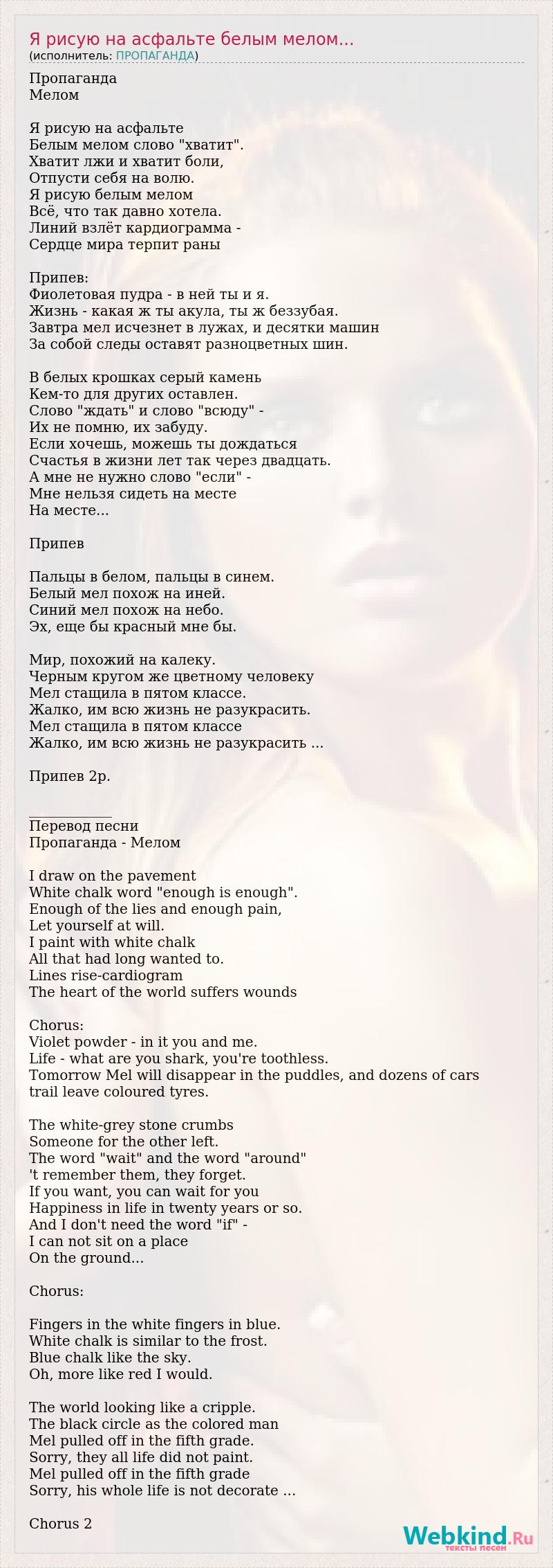Пропаганда Мелом Я рисую на асфальте Белым мелом слово "хватит". Хватит лжи и хватит боли, Отпусти себя на волю. Я рисую белым мелом Всё, что так давно хотела. Линий взлёт кардиограмма - Сердце мира терпит раны Припев: Фиолетовая пудра - в ней ты и я. Жизнь - какая ж ты акула, ты ж беззубая. Завтра мел исчезнет в лужах, и десятки машин За собой следы оставят разноцветных шин. В белых крошках серый камень Кем-то для других оставлен. Слово "ждать" и слово "всюду" - Их не помню, их забуду. Если хочешь, можешь ты дождаться Счастья в жизни лет так через двадцать. А мне не нужно слово "если" - Мне нельзя сидеть на месте На месте... Припев Пальцы в белом, пальцы в синем. Белый мел похож на иней. Синий мел похож на небо. Эх, еще бы красный мне бы. Мир, похожий на калеку. Черным кругом же цветному человеку Мел стащила в пятом классе. Жалко, им всю жизнь не разукрасить. Мел стащила в пятом классе Жалко, им всю жизнь не разукрасить ... Припев 2р. ____________ Перевод песни Пропаганда - Мелом I draw on the pavement White chalk word "enough is enough". Enough of the lies and enough pain, Let yourself at will. I paint with white chalk All that had long wanted to. Lines rise-cardiogram The heart of the world suffers wounds Chorus: Violet powder - in it you and me. Life - what are you shark, you're toothless. Tomorrow Mel will disappear in the puddles, and dozens of cars trail leave coloured tyres. The white-grey stone crumbs Someone for the other left. The word "wait" and the word "around" 't remember them, they forget. If you want, you can wait for you Happiness in life in twenty years or so. And I don't need the word "if" - I can not sit on a place On the ground... Chorus: Fingers in the white fingers in blue. White chalk is similar to the frost. Blue chalk like the sky. Oh, more like red I would. The world looking like a cripple. The black circle as the colored man Mel pulled off in the fifth grade. Sorry, they all life did not paint. Mel pulled off in the fifth grade Sorry, his whole life is not decorate ... Chorus 2
