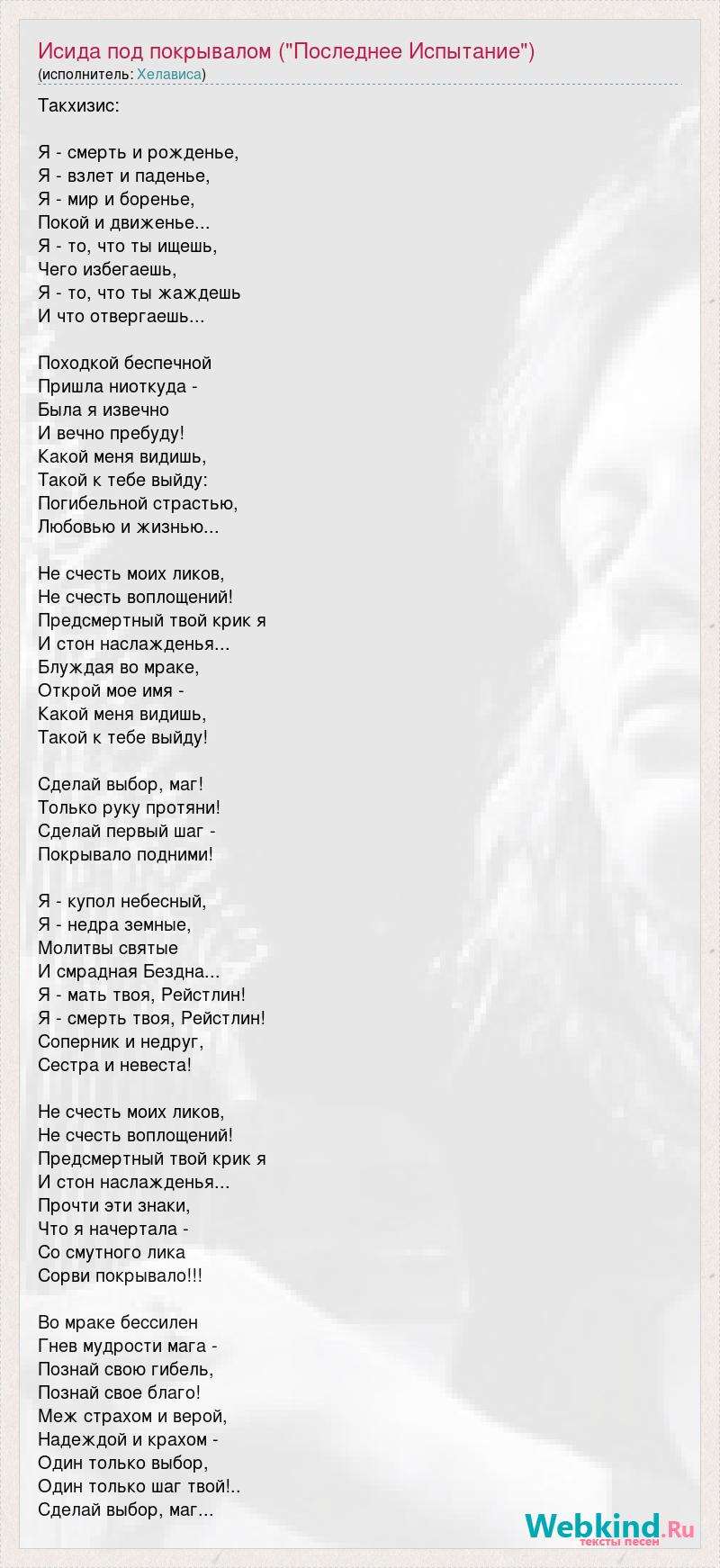 Такхизис: Я - смерть и рожденье, Я - взлет и паденье, Я - мир и боренье, Покой и движенье... Я - то, что ты ищешь, Чего избегаешь, Я - то, что ты жаждешь И что отвергаешь... Походкой беспечной Пришла ниоткуда - Была я извечно И вечно пребуду! Какой меня видишь, Такой к тебе выйду: Погибельной страстью, Любовью и жизнью... Не счесть моих ликов, Не счесть воплощений! Предсмертный твой крик я И стон наслажденья... Блуждая во мраке, Открой мое имя - Какой меня видишь, Такой к тебе выйду! Сделай выбор, маг! Только руку протяни! Сделай первый шаг - Покрывало подними! Я - купол небесный, Я - недра земные, Молитвы святые И смрадная Бездна... Я - мать твоя, Рейстлин! Я - смерть твоя, Рейстлин! Соперник и недруг, Сестра и невеста! Не счесть моих ликов, Не счесть воплощений! Предсмертный твой крик я И стон наслажденья... Прочти эти знаки, Что я начертала - Со смутного лика Сорви покрывало!!! Во мраке бессилен Гнев мудрости мага - Познай свою гибель, Познай свое благо! Меж страхом и верой, Надеждой и крахом - Один только выбор, Один только шаг твой!.. Сделай выбор, маг...