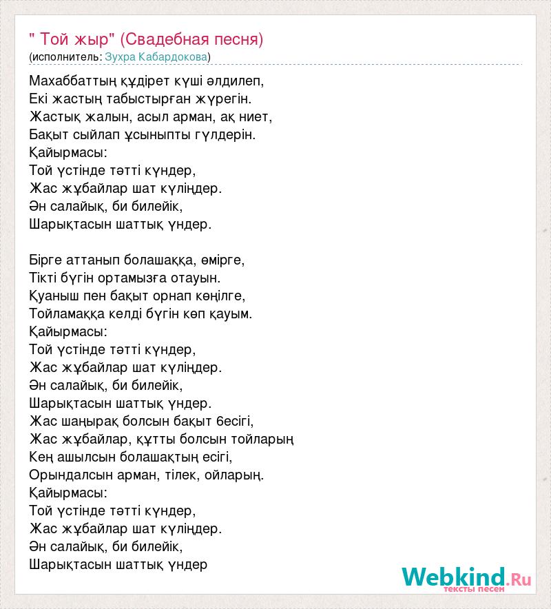 Махаббаттың құдірет күші әлдилеп, Екі жастың табыстырған жүрегін. Жастық жалын, асыл арман, ақ ниет, Бақыт сыйлап ұсыныпты гүлдерін. Қайырмасы: Той үстiнде тәтті күндер, Жас жұбайлар шат күліңдер. Ән салайық, би билейік, Шарықтасын шаттық үндер. Бipгe аттанып болашаққа, өмipгe, Tiктi бүгін ортамызға отауын. Қуаныш пен бақыт орнап көңілге, Тойламаққа келді бүгін көп қауым. Қайырмасы: Той үстiнде тәтті күндер, Жас жұбайлар шат күліңдер. Ән салайық, би билейік, Шарықтасын шаттық үндер. Жас шаңырақ болсын бақыт 6eciгi, Жас жұбайлар, құтты болсын тойларың Кең ашылсын болашақтың eciгi, Орындалсын арман, тiлек, ойларың. Қайырмасы: Той үстiнде тәтті күндер, Жас жұбайлар шат күліңдер. Ән салайық, би билейік, Шарықтасын шаттық үндер