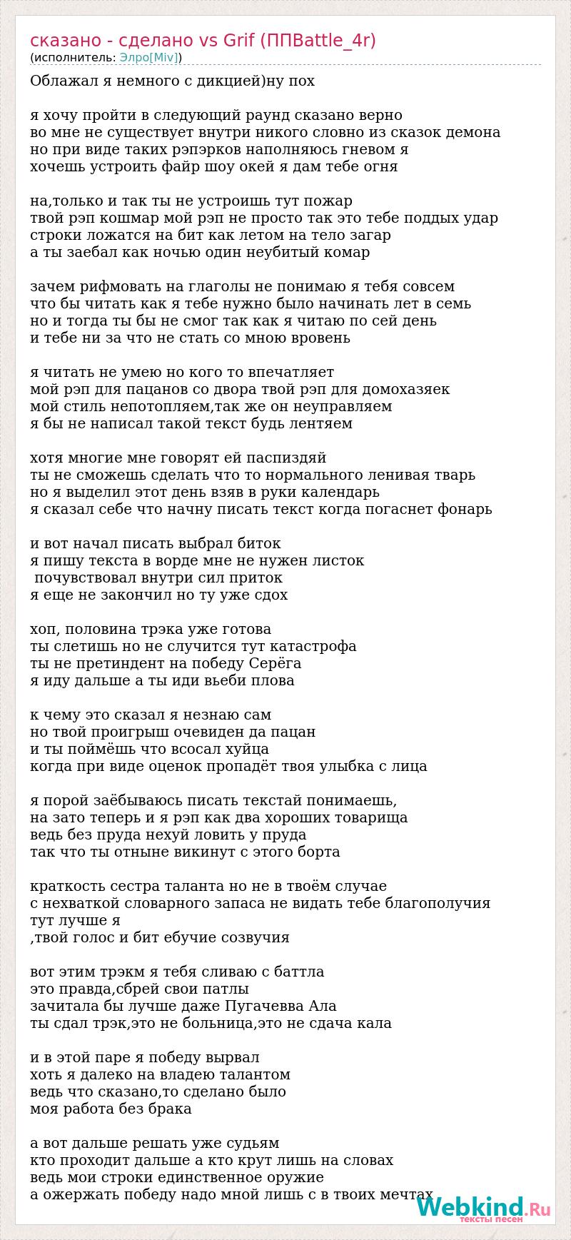 А как ты думаешь, о чем песня "Сказано - сделано vs Grif (ППBattle_4r)" ?