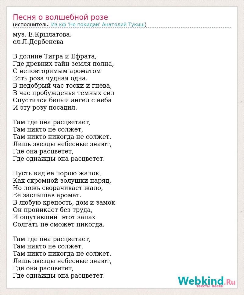 муз. Е.Крылатова. сл.Л.Дербенева В долине Тигра и Ефрата, Где древних тайн земля полна, С неповторимым ароматом Есть роза чудная одна. В недобрый час тоски и гнева, В час пробужденья темных сил Спустился белый ангел с неба И эту розу посадил. Там где она расцветает, Там никто не солжет, Там никто никогда не солжет. Лишь звезды небесные знают, Где она расцветет, Где однажды она расцветет. Пусть вид ее порою жалок, Как скромной золушки наряд, Но ложь сворачивает жало, Ее заслышав аромат. В любую крепость, дом и замок Он проникает без труда, И ощутивший этот запах Солгать не сможет никогда. Там где она расцветает, Там никто не солжет, Там никто никогда не солжет. Лишь звезды небесные знают, Где она расцветет, Где однажды она расцветет.