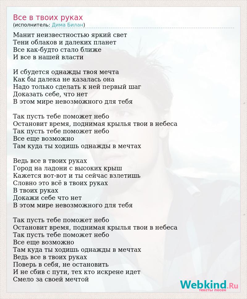 Манит неизвестностью яркий свет Тени облаков и далеких планет Все как-будто стало ближе И все в нашей власти И сбудется однажды твоя мечта Как бы далека не казалась она Надо только сделать к ней первый шаг Доказать себе, что нет В этом мире невозможного для тебя Так пусть тебе поможет небо Остановит время, поднимая крылья твои в небеса Так пусть тебе поможет небо Все еще возможно Там куда ты ходишь однажды в мечтах Ведь все в твоих руках Город на ладони с высоких крыш Кажется вот-вот и ты сейчас взлетишь Словно это всё в твоих руках В твоих руках Докажи себе что нет В этом мире невозможного для тебя Так пусть тебе поможет небо Остановит время, поднимая крылья твои в небеса Так пусть тебе поможет небо Все еще возможно Там куда ты ходишь однажды в мечтах Ведь все в твоих руках Поверь в себя, не остановить И не сбив с пути, тех кто искрене идет Смело за своей мечтой
