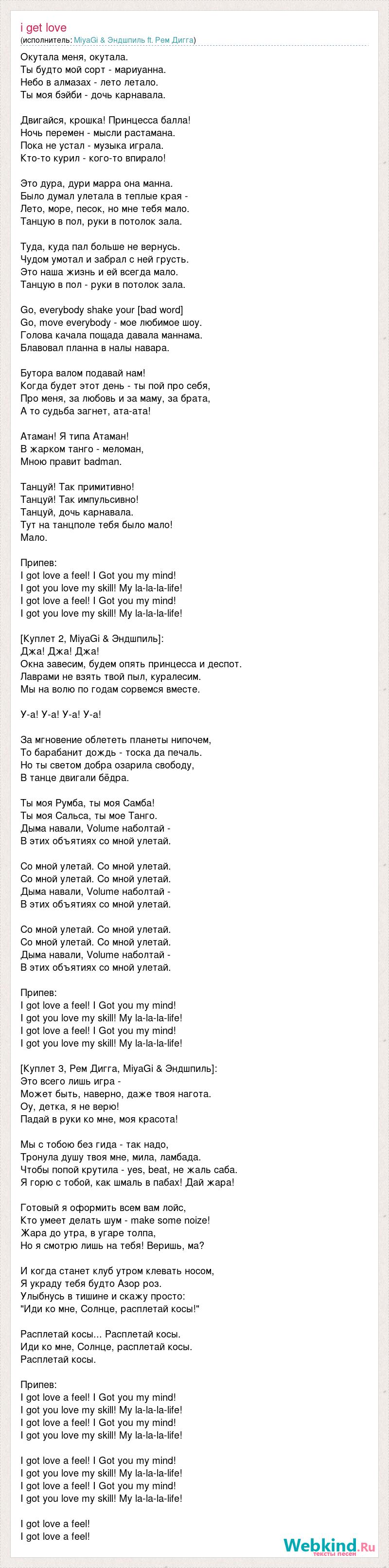 Окутала меня, окутала. Ты будто мой сорт - мариуанна. Небо в алмазах - лето летало. Ты моя бэйби - дочь карнавала. Двигайся, крошка! Принцесса балла! Ночь перемен - мысли растамана. Пока не устал - музыка играла. Кто-то курил - кого-то впирало! Это дура, дури марра она манна. Было думал улетала в теплые края - Лето, море, песок, но мне тебя мало. Танцую в пол, руки в потолок зала. Туда, куда пал больше не вернусь. Чудом умотал и забрал с ней грусть. Это наша жизнь и ей всегда мало. Танцую в пол - руки в потолок зала. Go, everybody shake your [bad word] Go, move everybody - мое любимое шоу. Голова качала пощада давала маннама. Блавовал планна в налы навара. Бутора валом подавай нам! Когда будет этот день - ты пой про себя, Про меня, за любовь и за маму, за брата, А то судьба загнет, ата-ата! Атаман! Я типа Атаман! В жарком танго - меломан, Мною правит badman. Танцуй! Так примитивно! Танцуй! Так импульсивно! Танцуй, дочь карнавала. Тут на танцполе тебя было мало! Мало. Припев: I got love a feel! I Got you my mind! I got you love my skill! My la-la-la-life! I got love a feel! I Got you my mind! I got you love my skill! My la-la-la-life! [Куплет 2, MiyaGi & Эндшпиль]: Джа! Джа! Джа! Окна завесим, будем опять принцесса и деспот. Лаврами не взять твой пыл, куралесим. Мы на волю по годам сорвемся вместе. У-а! У-а! У-а! У-а! За мгновение облететь планеты нипочем, То барабанит дождь - тоска да печаль. Но ты светом добра озарила свободу, В танце двигали бёдра. Ты моя Румба, ты моя Самба! Ты моя Сальса, ты мое Танго. Дыма навали, Volume наболтай - В этих объятиях со мной улетай. Со мной улетай. Со мной улетай. Со мной улетай. Со мной улетай. Дыма навали, Volume наболтай - В этих объятиях со мной улетай. Со мной улетай. Со мной улетай. Со мной улетай. Со мной улетай. Дыма навали, Volume наболтай - В этих объятиях со мной улетай. Припев: I got love a feel! I Got you my mind! I got you love my skill! My la-la-la-life! I got love a feel! I Got you my mind! I got you love my skill! My la-la-la-life! [Куплет 3, Рем Дигга, MiyaGi & Эндшпиль]: Это всего лишь игра - Может быть, наверно, даже твоя нагота. Оу, детка, я не верю! Падай в руки ко мне, моя красота! Мы с тобою без гида - так надо, Тронула душу твоя мне, мила, ламбада. Чтобы попой крутила - yes, beat, не жаль саба. Я горю с тобой, как шмаль в пабах! Дай жара! Готовый я оформить всем вам лойс, Кто умеет делать шум - make some noize! Жара до утра, в угаре толпа, Но я смотрю лишь на тебя! Веришь, ма? И когда станет клуб утром клевать носом, Я украду тебя будто Азор роз. Улыбнусь в тишине и скажу просто: "Иди ко мне, Солнце, расплетай косы!" Расплетай косы... Расплетай косы. Иди ко мне, Солнце, расплетай косы. Расплетай косы. Припев: I got love a feel! I Got you my mind! I got you love my skill! My la-la-la-life! I got love a feel! I Got you my mind! I got you love my skill! My la-la-la-life! I got love a feel! I Got you my mind! I got you love my skill! My la-la-la-life! I got love a feel! I Got you my mind! I got you love my skill! My la-la-la-life! I got love a feel! I got love a feel!