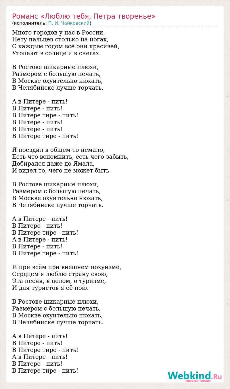 Много городов у нас в России, Нету пальцев столько на ногах, С каждым годом всё они красивей, Утопают в солнце и в снегах. В Ростове шикарные плюхи, Размером с большую печать, В Москве охуительно нюхать, В Челябинске лучше торчать. А в Питере - пить! В Питере - пить! В Питере тире - пить! В Питере - пить! В Питере - пить! В Питере тире - пить! Я поездил в общем-то немало, Есть что вспомнить, есть чего забыть, Добирался даже до Ямала, И видел то, чего не может быть. В Ростове шикарные плюхи, Размером с большую печать, В Москве охуительно нюхать, В Челябинске лучше торчать. А в Питере - пить! В Питере - пить! В Питере тире - пить! А в Питере - пить! В Питере - пить! В Питере тире - пить! И при всём при внешнем похуизме, Сердцем я люблю страну свою, Эта песня, в целом, о туризме, И для туристов я её пою. В Ростове шикарные плюхи, Размером с большую печать, В Москве охуительно нюхать, В Челябинске лучше торчать. А в Питере - пить! В Питере - пить! В Питере тире - пить! А в Питере - пить! В Питере - пить! В Питере тире - пить!