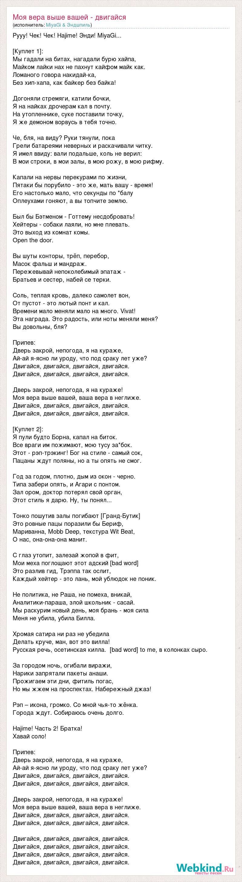 Рууу! Чек! Чек! Hajime! Энди! MiyaGi... [Куплет 1]: Мы гадали на битах, нагадали бурю хайпа, Майком лайки нах не пахнут кайфом майк как. Ломаного говора накидай-ка, Без хип-хапа, как байкер без байка! Догоняли стремяги, катили бочки, Я на найках дрочерам кал в почту. На утопленнике, суке поставили точку, Я же демоном ворвусь в тебя точно. Че, бля, на виду? Руки тянули, пока Грели батареями неверных и раскачивали читку. Я имел ввиду: вали подальше, коль не верил: В мои строки, в мои залы, в мою рожу, в мою рифму. Капали на нервы перекурами по жизни, Пятаки бы порубило - это же, мать вашу - время! Его настолько мало, что секунды по *балу Оплеухами гоняют, а вы топчите землю. Был бы Бэтменом - Готтему несдобровать! Хейтеры - собаки лаяли, но мне плевать. Это выход из комнат комы. Open the door. Вы шуты конторы, трёп, перебор, Масок фальш и мандраж. Пережевывай непоколебимый эпатаж - Братьев и сестер, набей се терки. Соль, теплая кровь, далеко самолет вон, От пустот - это лютый понт и кал. Времени мало меняли мало на много. Vivat! Эта награда. Это радость, или ноты меняли меня? Вы довольны, бля? Припев: Дверь закрой, непогода, я на кураже, Ай-ай я-ясно ли уроду, что под сраку лет уже? Двигайся, двигайся, двигайся, двигайся. Двигайся, двигайся, двигайся, двигайся. Дверь закрой, непогода, я на кураже! Моя вера выше вашей, ваша вера в неглиже. Двигайся, двигайся, двигайся, двигайся. Двигайся, двигайся, двигайся, двигайся. [Куплет 2]: Я пули будто Борна, капал на биток. Все враги им пожимают, мою тусу за*бок. Этот - рэп-трэкинг! Бог на стиле - самый сок, Пацаны ждут поляны, но а ты опять не смог. Год за годом, плотно, дым из окон - черно. Типа забери опять, и Агари с понтом. Зал ором, доктор потерял свой орган, Этот стиль я дарю. Ну, ты понял... Тонко пошутив залы погибают [Гранд-Бутик] Это ровные пацы поразили бы Бериф, Мариванна, Mobb Deep, текстура Wit Beat, О нас, она-она-она манит. С глаз утопит, залезай жопой в фит, Мои меха поглощают этот адский [bad word] Это разлив гид, Трэппа так ослит, Каждый хейтер - это лань, мой ублюдок не поник. Не политика, не Раша, не помеха, вникай, Аналитики-параша, злой школьник - сасай. Мы раскурим новый день, моя брань - моя сила Меня не убила, убила Билла. Хромая сатира ни раз не убедила Делать круче, ман, вот это вилла! Русская речь, осетинская килла. [bad word] to me, в колонках сыро. За городом ночь, огибали виражи, Нарики запрятали пакеты анаши. Прожигаем эти дни, фитиль погас, Но мы жжем на проспектах. Набережный джаз! Рэп – икона, громко. Со мной чья-то жёнка. Города ждут. Собираюсь очень долго. Hajime! Часть 2! Братка! Хавай соло! Припев: Дверь закрой, непогода, я на кураже, Ай-ай я-ясно ли уроду, что под сраку лет уже? Двигайся, двигайся, двигайся, двигайся. Двигайся, двигайся, двигайся, двигайся. Дверь закрой, непогода, я на кураже! Моя вера выше вашей, ваша вера в неглиже. Двигайся, двигайся, двигайся, двигайся. Двигайся, двигайся, двигайся, двигайся. Двигайся, двигайся, двигайся, двигайся. Двигайся, двигайся, двигайся, двигайся. Двигайся, двигайся, двигайся, двигайся. Двигайся, двигайся, двигайся, двигайся.