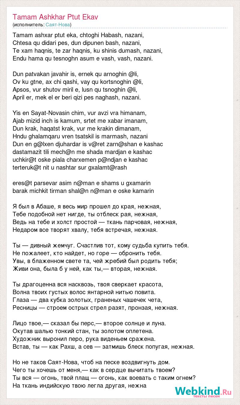 Tamam ashxar ptut eka, chtoghi Habash, nazani, Chtesa qu didari pes, dun dipunen bash, nazani, Te xam haqnis, te zar haqnis, ku shinis dumash, nazani, Endu hama qu tesnoghn asum e vash, vash, nazani. Dun patvakan javahir is, ernek qu arnoghin @li, Ov ku gtne, ax chi qashi, vay qu kortsnoghin @li, Apsos, vur shutov miril e, lusn qu tsnoghin @li, April er, mek el er beri qizi pes naghash, nazani. Yis en Sayat-Novasin chim, vur avzi vra himanam, Ajab mizid inch is kamum, srtet me xabar imanam, Dun krak, haqatst krak, vur me krakin dimanam, Hndu ghalamqaru vren tsatskil is marmash, nazani Dun en g@lxen djuhardar is v@ret zarn@shan e kashac dastamazit tili mech@n me shada mardjan e kashac uchkir@t oske piala charxemen p@ndjan e kashac terteruk@t nit u nashtar sur gxalamt@rash eres@t parsevar asim n@man e shams u gxamarin barak michkit tirman shal@n n@man e oske kamarin Я был в Абаше, я весь мир прошел до края, нежная, Тебе подобной нет нигде, ты отблеск рая, нежная, Ведь на тебе и холст простой — ткань парчовая, нежная, Недаром все творят хвалу, тебя встречая, нежная. Ты — дивный жемчуг. Счастлив тот, кому судьба купить тебя. Не пожалеет, кто найдет, но горе — обронить тебя. Увы, в блаженном свете та, чей жребий был родить тебя; Живи она, была б у ней, как ты,— вторая, нежная. Ты драгоценна вся насквозь, твоя сверкает красота, Волна твоих густых волос янтарной нитью повита. Глаза — два кубка золотых, граненых чашечек чета, Ресницы — строем острых стрел разят, пронзая, нежная. Лицо твое,— сказал бы перс,— второе солнце и луна. Окутав шалью тонкий стан, ты золотом оплетена. Художник выронил перо, рука виденьем сражена. Встав, ты — как Рахш, а сев — затмишь блеск попугая, нежная. Но не таков Саят-Нова, чтоб на песке воздвигнуть дом. Чего ты хочешь от меня,— как в сердце вычитать твоем? Ты вся — огонь, твой плащ — огонь, как воевать с таким огнем? На ткань индийскую твою легла другая, нежна
