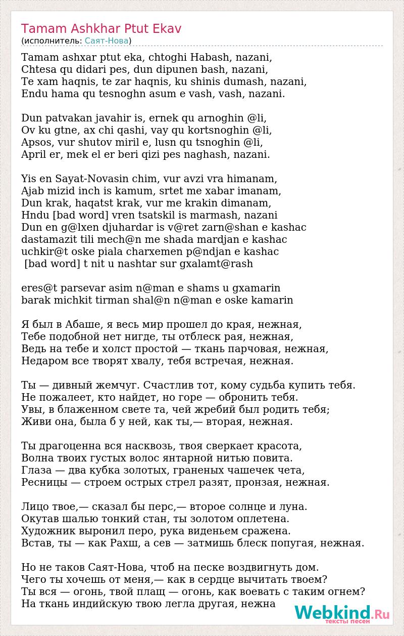 Tamam ashxar ptut eka, chtoghi Habash, nazani, Chtesa qu didari pes, dun dipunen bash, nazani, Te xam haqnis, te zar haqnis, ku shinis dumash, nazani, Endu hama qu tesnoghn asum e vash, vash, nazani. Dun patvakan javahir is, ernek qu arnoghin @li, Ov ku gtne, ax chi qashi, vay qu kortsnoghin @li, Apsos, vur shutov miril e, lusn qu tsnoghin @li, April er, mek el er beri qizi pes naghash, nazani. Yis en Sayat-Novasin chim, vur avzi vra himanam, Ajab mizid inch is kamum, srtet me xabar imanam, Dun krak, haqatst krak, vur me krakin dimanam, Hndu [bad word] vren tsatskil is marmash, nazani Dun en g@lxen djuhardar is v@ret zarn@shan e kashac dastamazit tili mech@n me shada mardjan e kashac uchkir@t oske piala charxemen p@ndjan e kashac [bad word] t nit u nashtar sur gxalamt@rash eres@t parsevar asim n@man e shams u gxamarin barak michkit tirman shal@n n@man e oske kamarin Я был в Абаше, я весь мир прошел до края, нежная, Тебе подобной нет нигде, ты отблеск рая, нежная, Ведь на тебе и холст простой — ткань парчовая, нежная, Недаром все творят хвалу, тебя встречая, нежная. Ты — дивный жемчуг. Счастлив тот, кому судьба купить тебя. Не пожалеет, кто найдет, но горе — обронить тебя. Увы, в блаженном свете та, чей жребий был родить тебя; Живи она, была б у ней, как ты,— вторая, нежная. Ты драгоценна вся насквозь, твоя сверкает красота, Волна твоих густых волос янтарной нитью повита. Глаза — два кубка золотых, граненых чашечек чета, Ресницы — строем острых стрел разят, пронзая, нежная. Лицо твое,— сказал бы перс,— второе солнце и луна. Окутав шалью тонкий стан, ты золотом оплетена. Художник выронил перо, рука виденьем сражена. Встав, ты — как Рахш, а сев — затмишь блеск попугая, нежная. Но не таков Саят-Нова, чтоб на песке воздвигнуть дом. Чего ты хочешь от меня,— как в сердце вычитать твоем? Ты вся — огонь, твой плащ — огонь, как воевать с таким огнем? На ткань индийскую твою легла другая, нежна